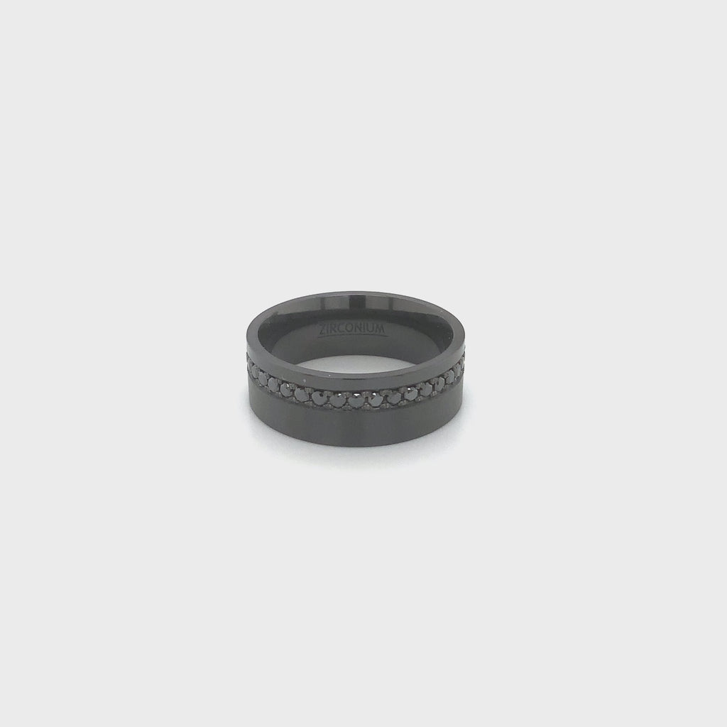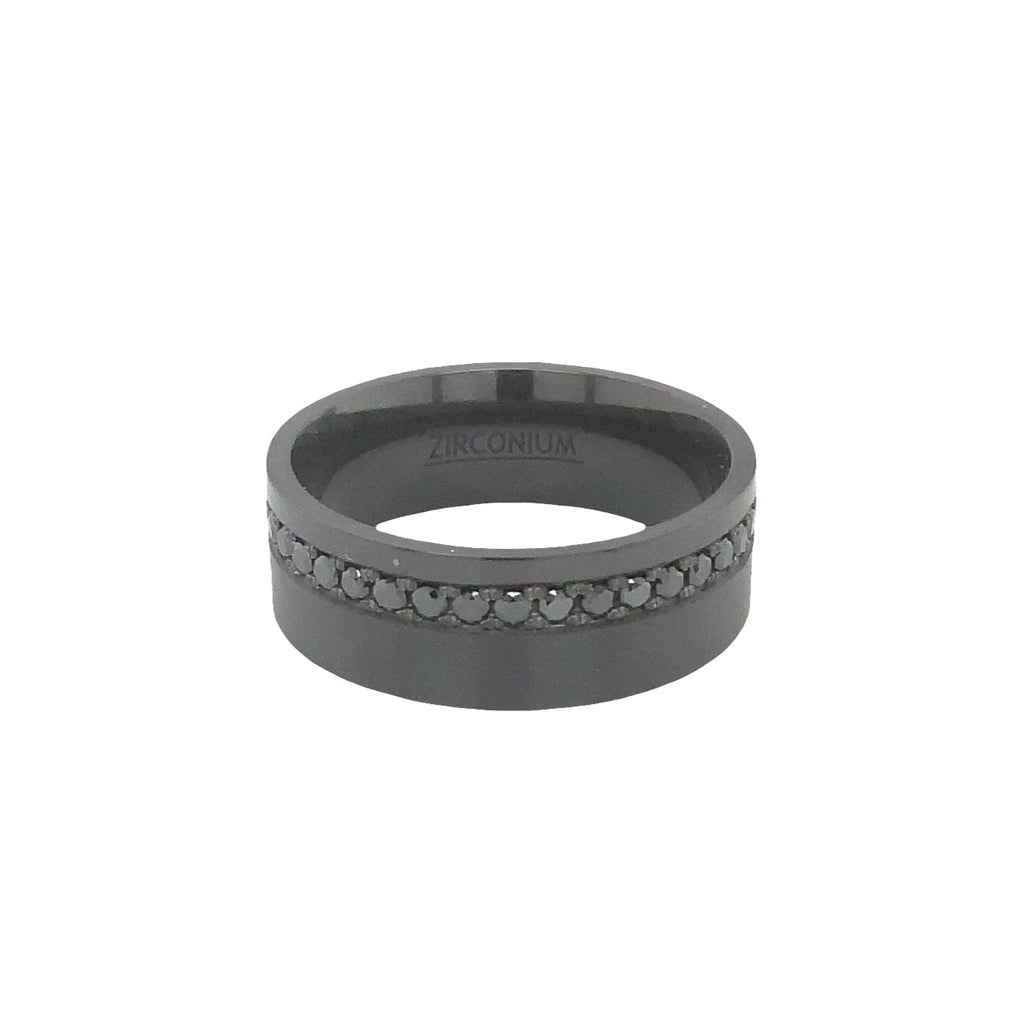 Contemporary Black Zirconium and Black Diamonds Eternity Off-Center Wedding Band.