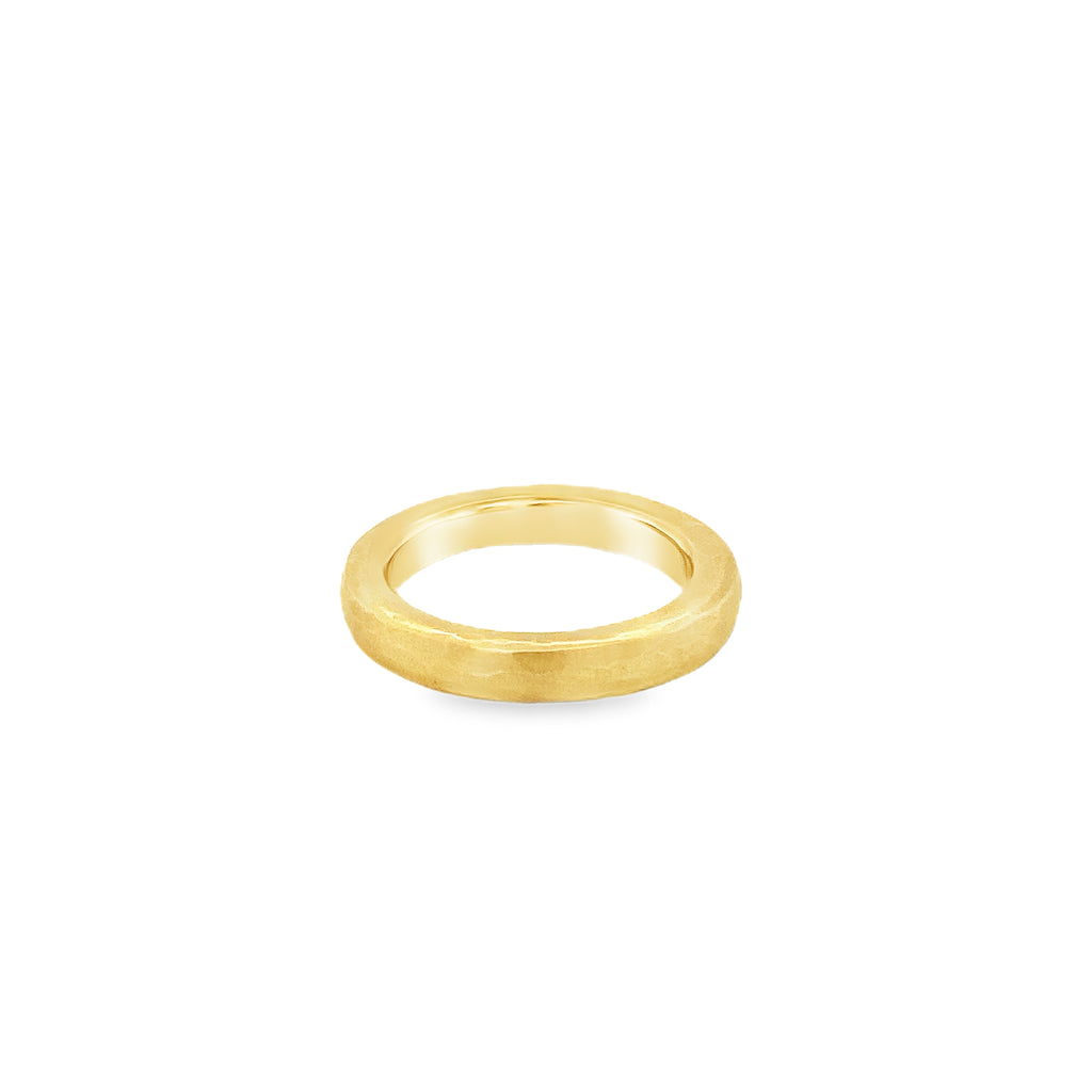 Handmade hammered-finish heavy 18K yellow gold wedding band.The band weight of this Band is 9 grams and is 3 mm thick. It's 3.56 mm wide.Finger size 7.