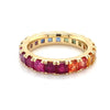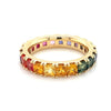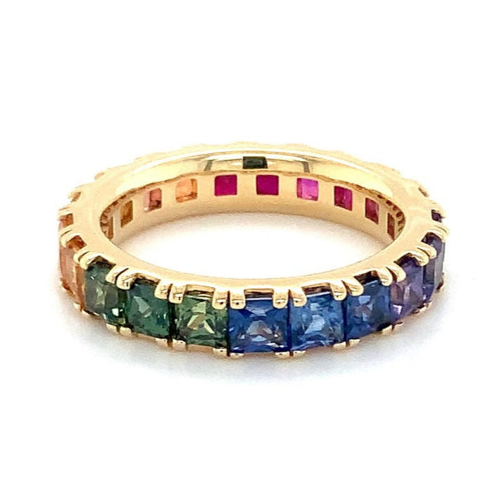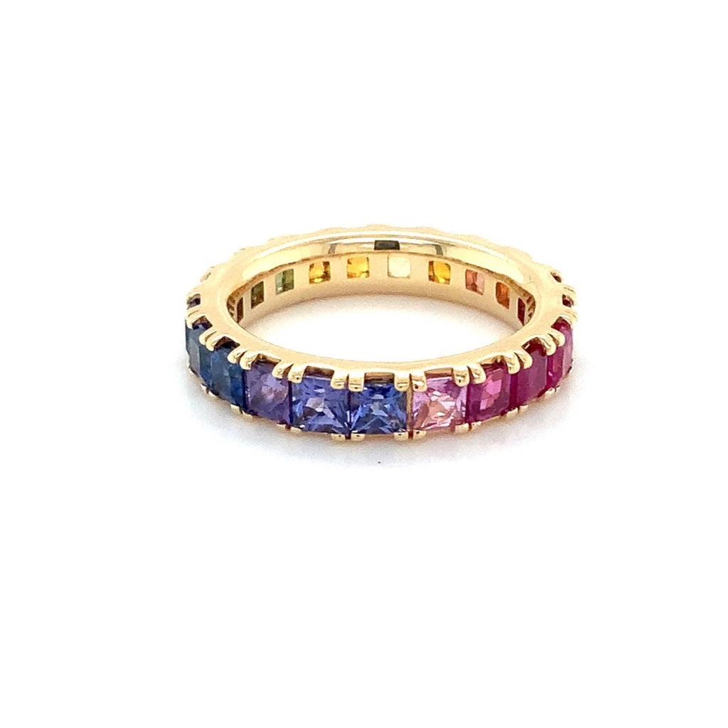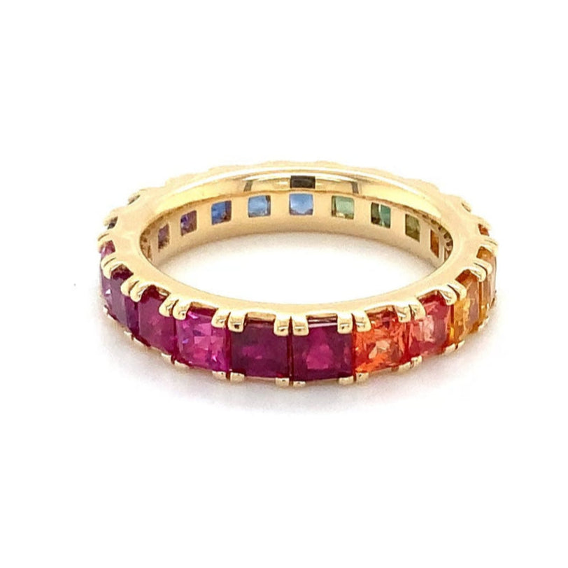 Experience the beauty of a Princess Cut Multi Color Sapphire Eternity Band in 18 kt Yellow Gold. These stunning Rainbow Sapphires are expertly cut in a Brilliant style and Spectrally set in a Share Prong design. Available in Finger Size 6,1/2, this ring is 4.09 mm wide and weighs 5.04 grams. Adorned with 21 Princess Cut Natural Sapphires totaling 4.65 cts t.w., this piece boasts exceptional clarity and craftsmanship.