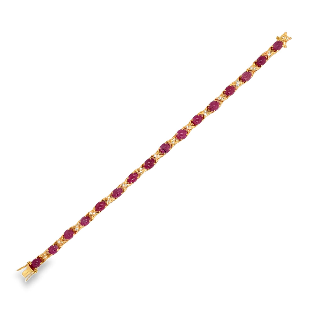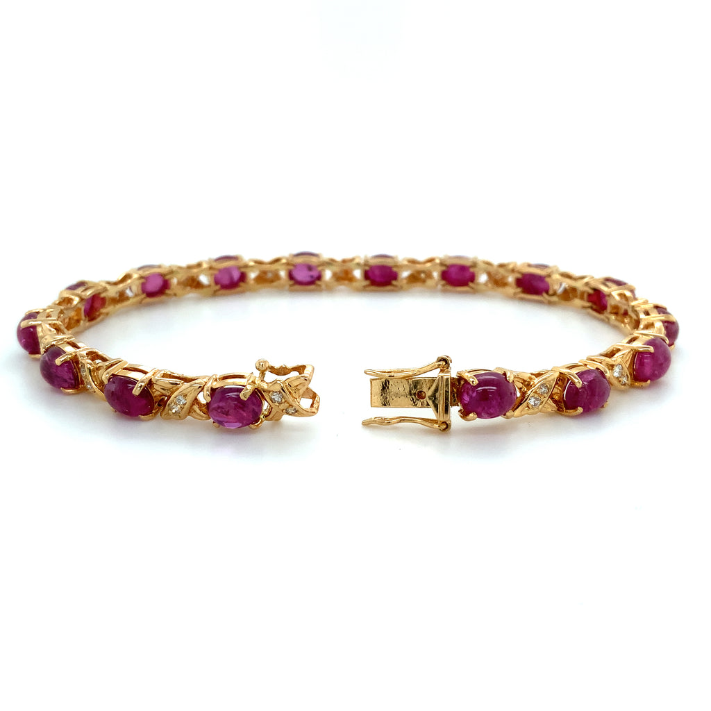 This bracelet features 16 Oval Cabochon Rubies, 4 Prong set = 15.04 cts est total weight