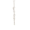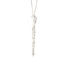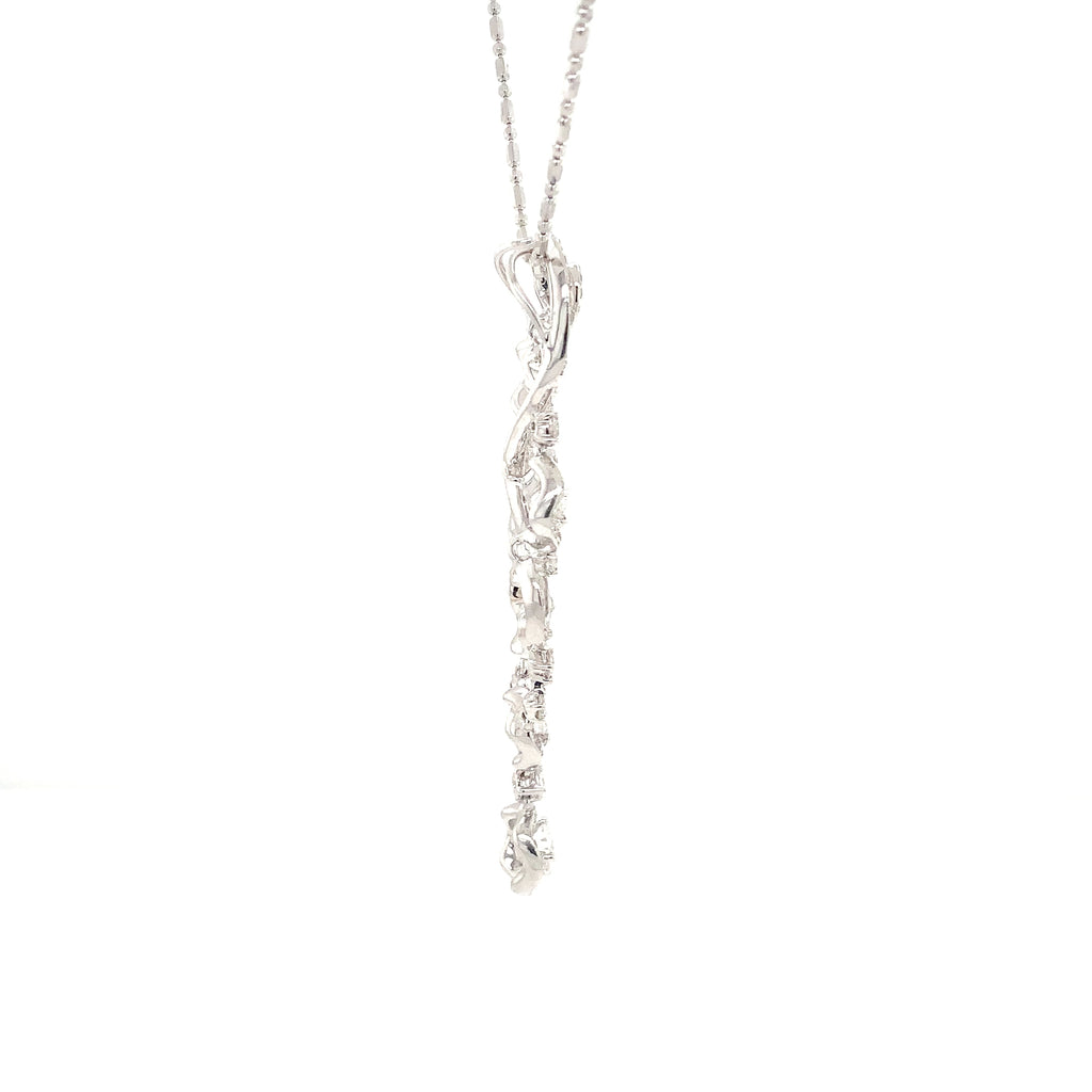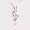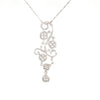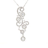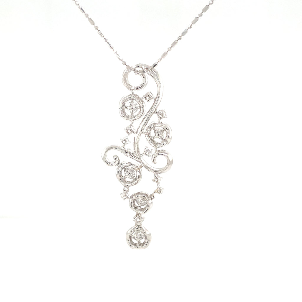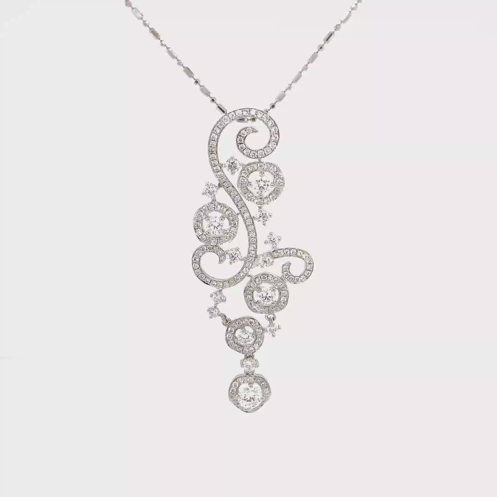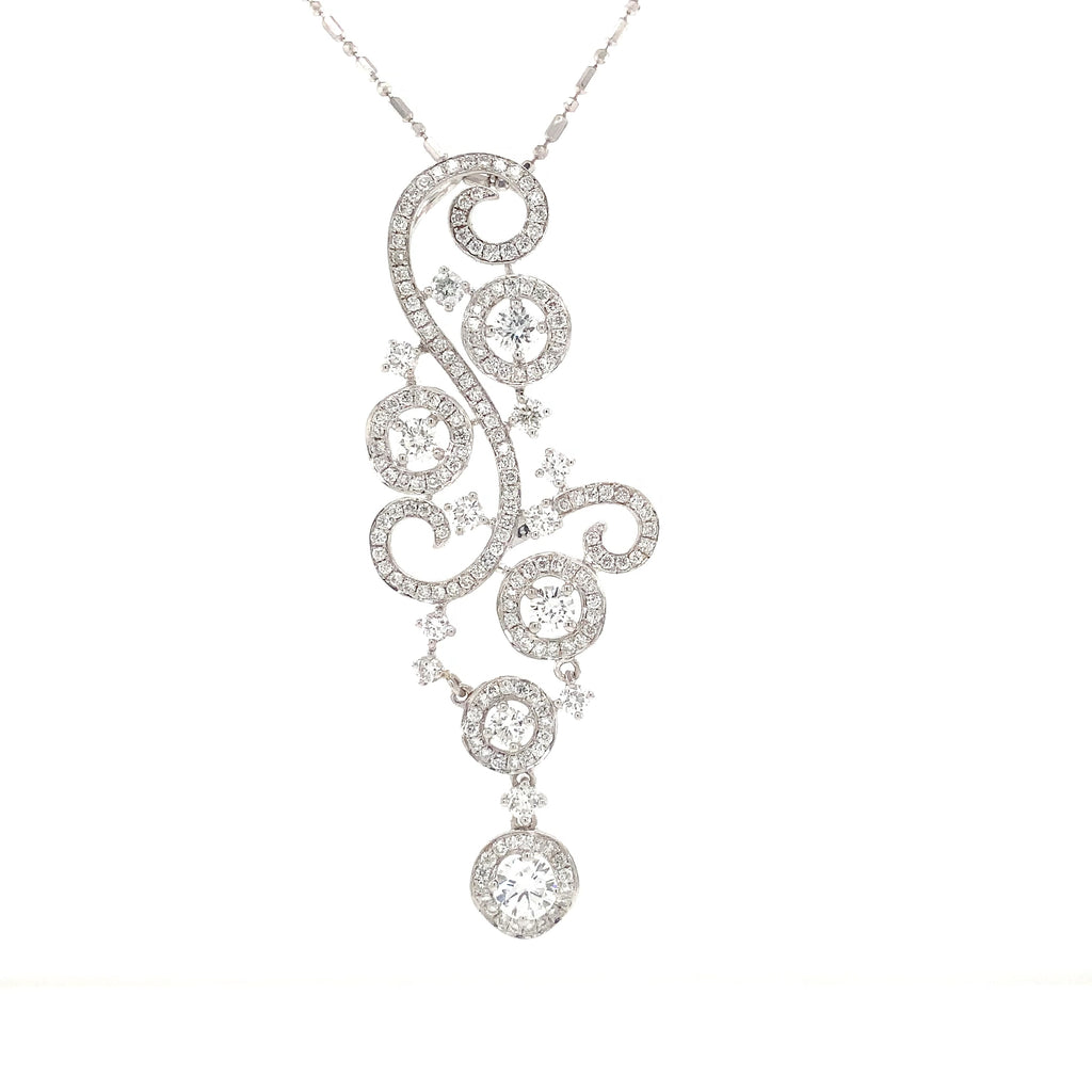 This exquisite pendant showcases an intricate swirl motif adorned with five diamond halos and pavé detailing, all meticulously crafted in 18K white gold.