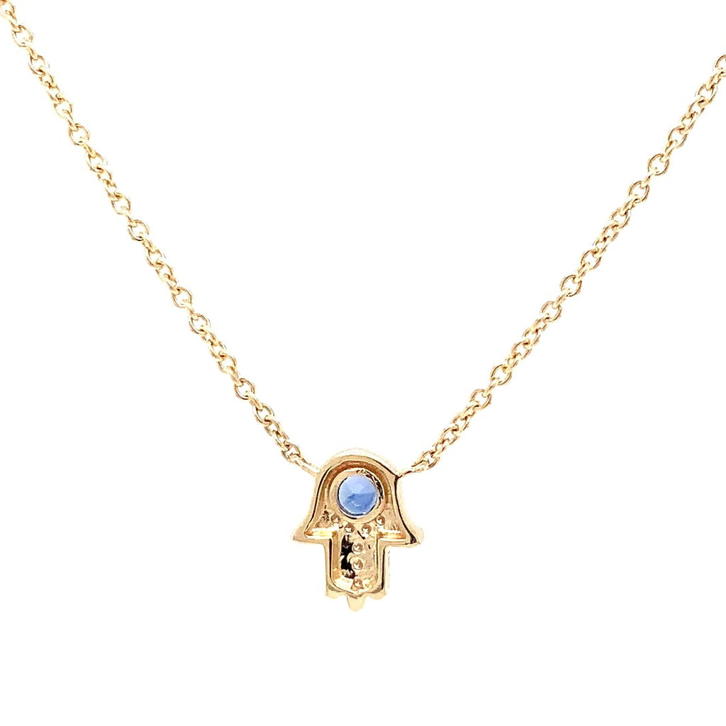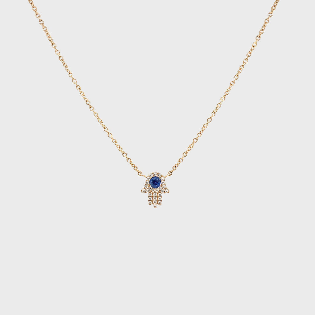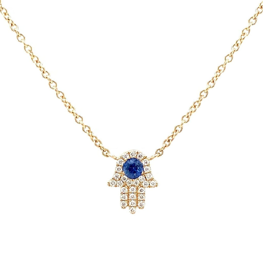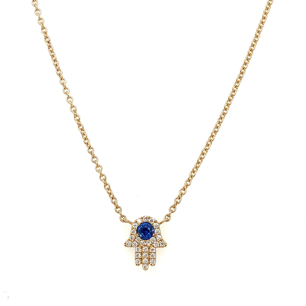 Crafted in 14K yellow gold, this Roman + Jules Hamsa pendant features 27 round brilliant diamonds totaling 0.10 ctw and 0.11 ctw round sapphire at its center.