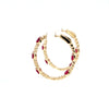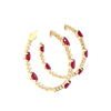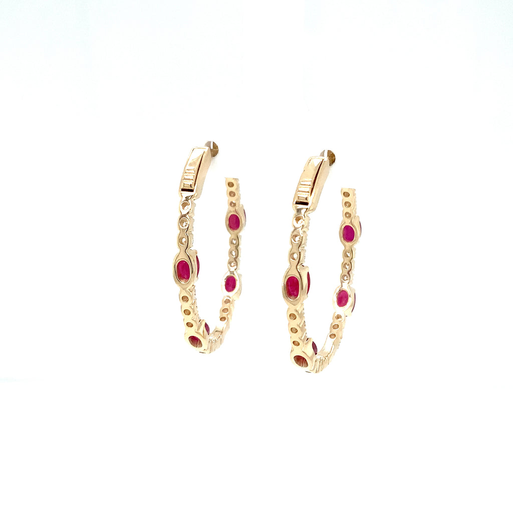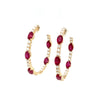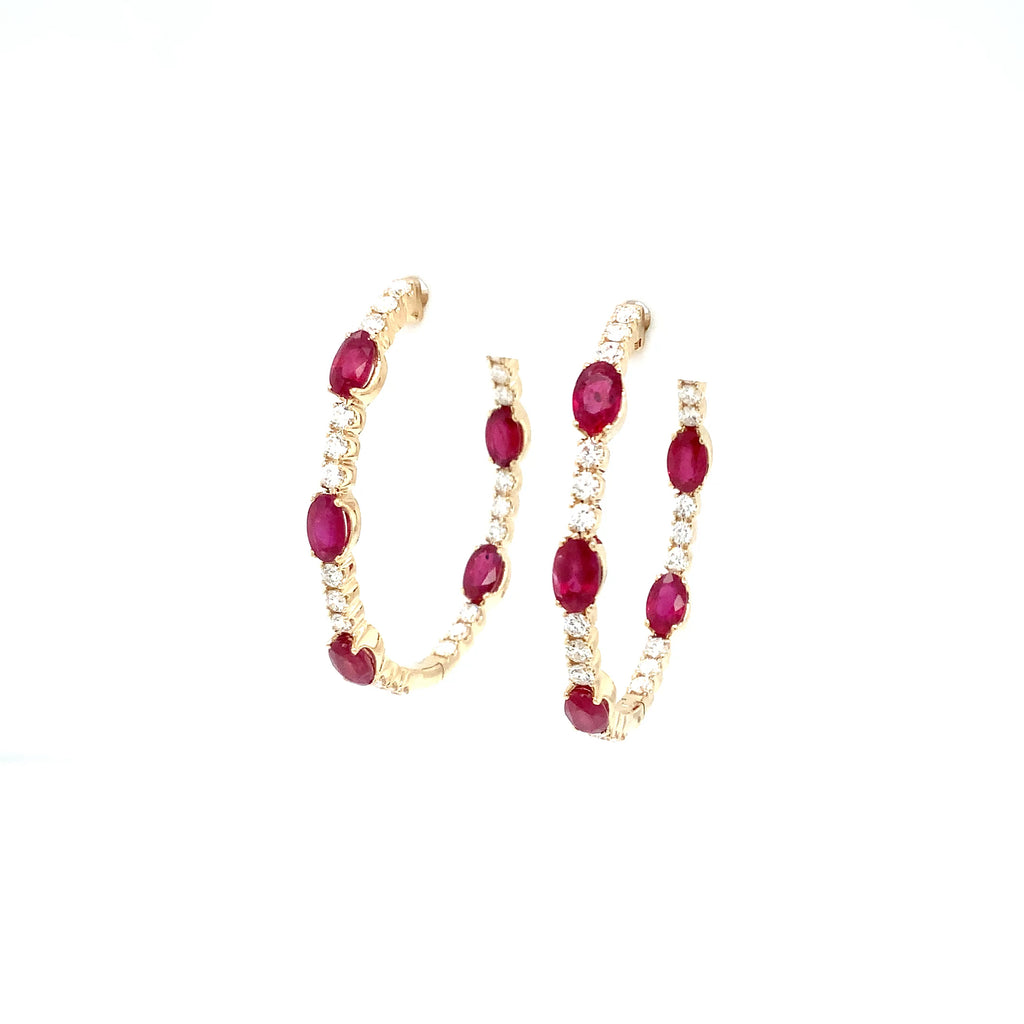 These 14K Yellow Gold Roman and Jules Fine Quality Oval Shape Ruby and Diamond Hoop Earrings exude sophistication and style. This earring features 10 Oval-Cut Bright Red Rubies totaling 3 cts. tw., with each Ruby measuring 5.00 x 3.00mm and securely prong set.