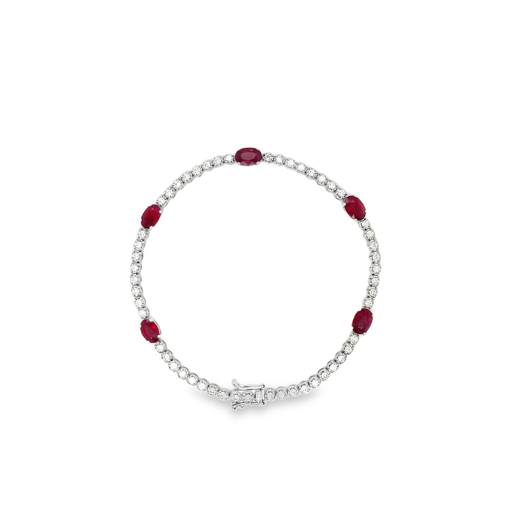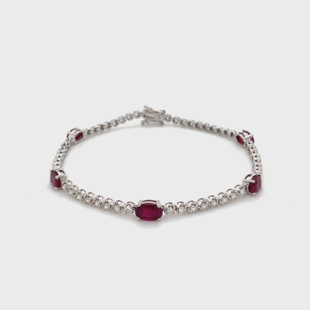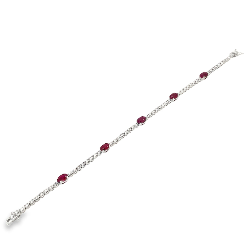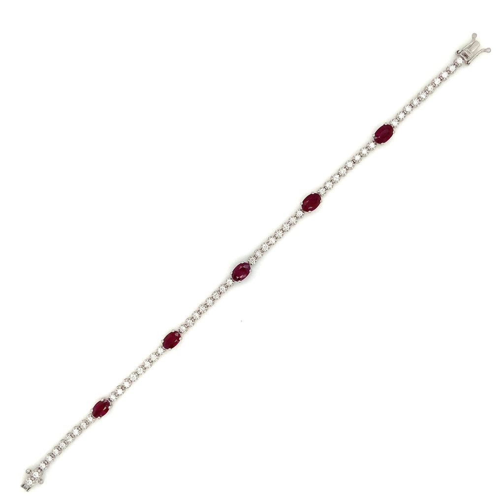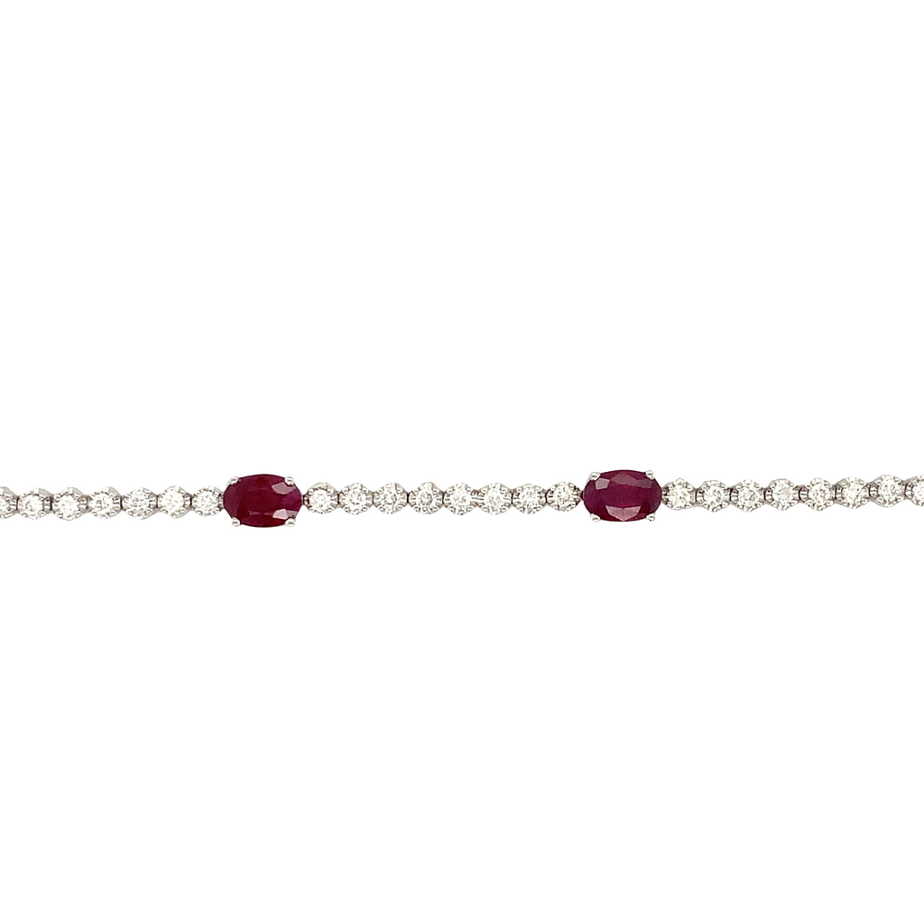 This Roman + Jules 14k white gold bracelet set includes five 6x4 mm oval-shaped Ruby (3.00cts tw) and fifty-two round brilliant cut diamonds (1.00cts).