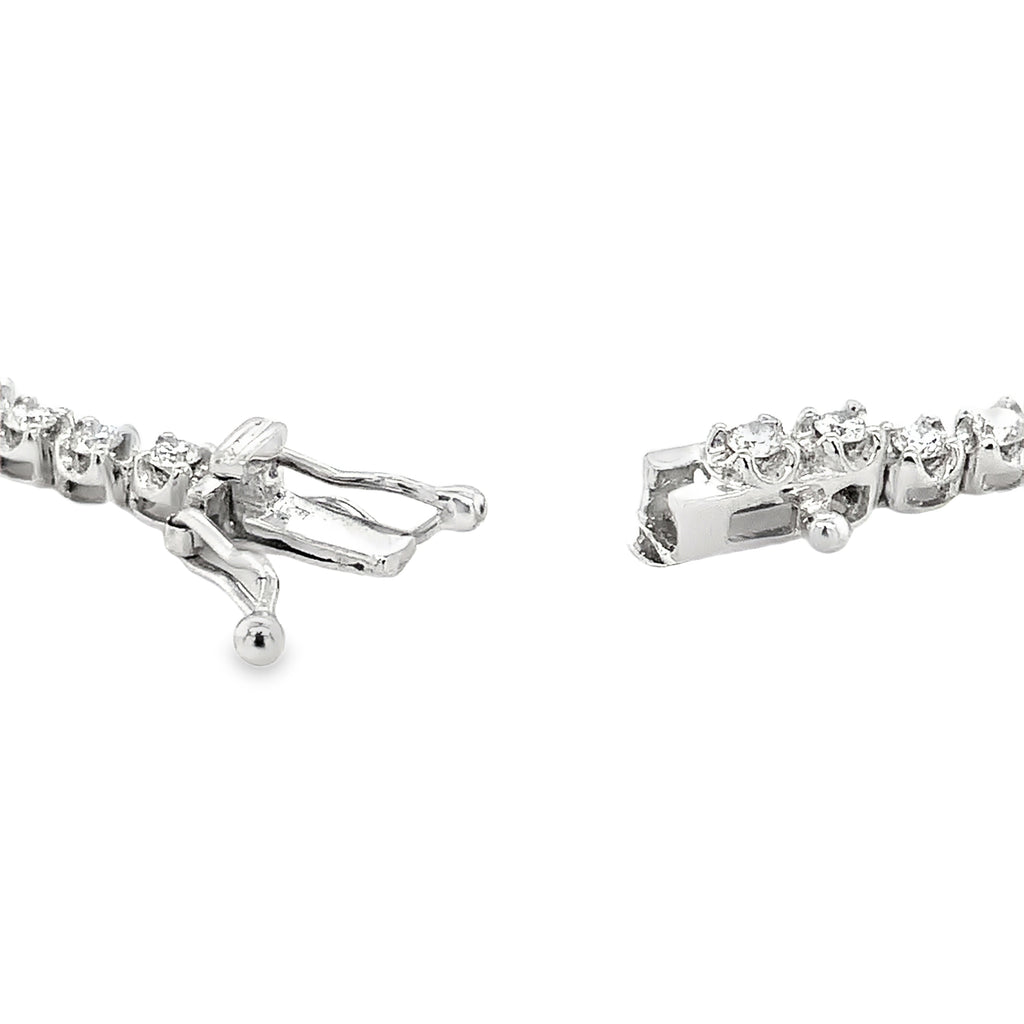 The diamonds are of F-G quality and feature VS clarity with excellent craftsmanship. Fastened with a plunging clasp, the bracelet has a length of 7" and a weight of 5.7 grams.