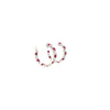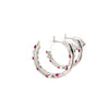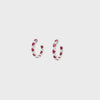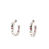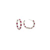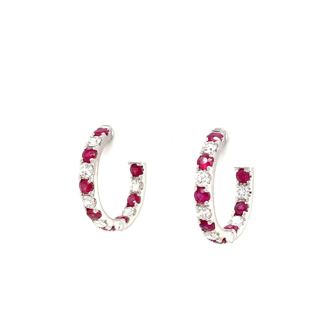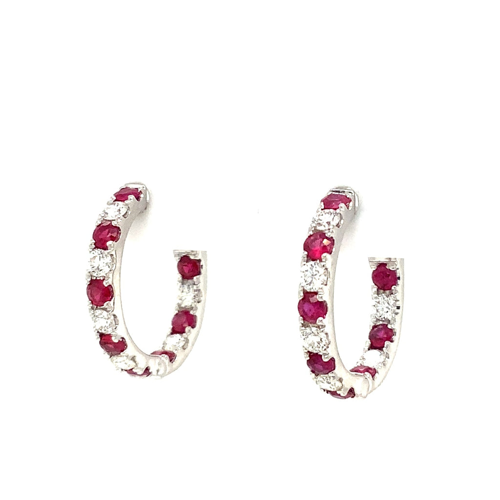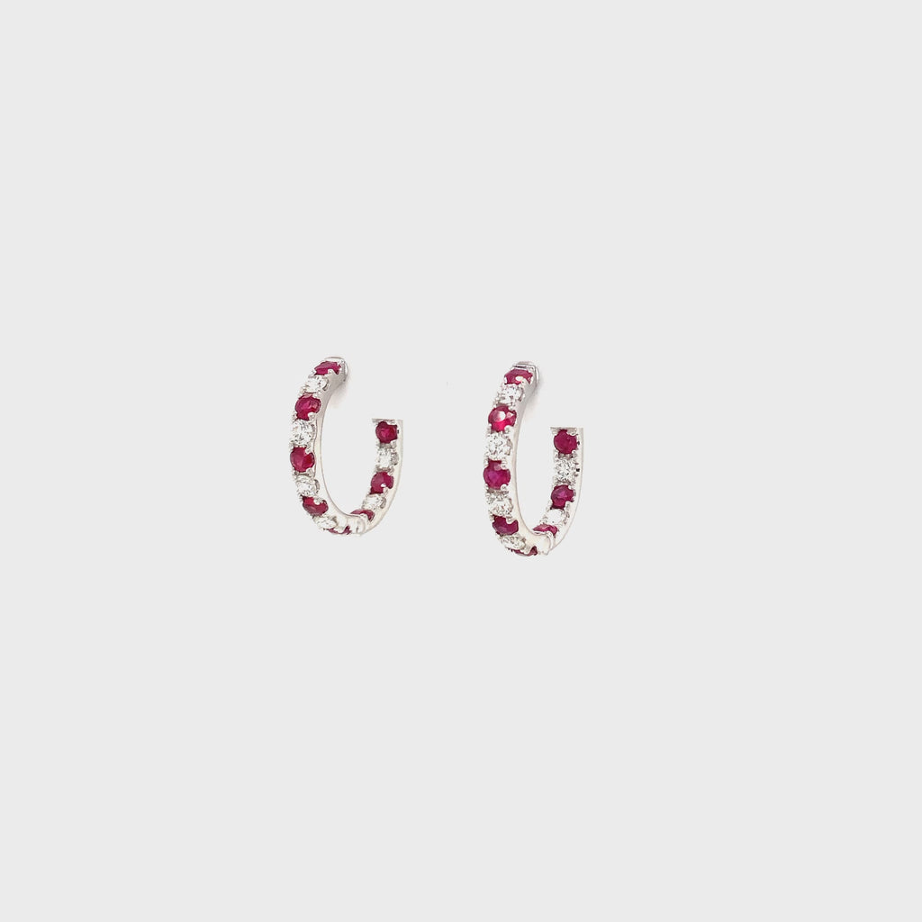 Roman + Jules Ruby and Diamond Inside and Outside Hoop Earrings 14K White Gold. This earring features 12 Round Red Rubies totaling 0.75 cts. tw., with each Ruby measuring 2.3mm. Each earring boasts 12 Round Brilliant Cut diamonds equal to 0.47ct, with a G color and VS clarity, expertly crafted and polished. The hinged Post adds convenience to this stunning piece of jewelry, with a Round Shape diameter of 15.15 mm and a weight of 2.8 grams.