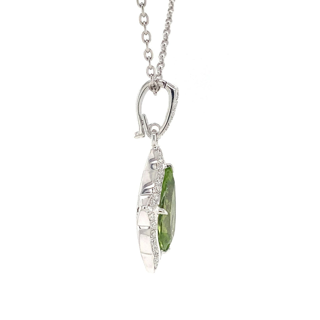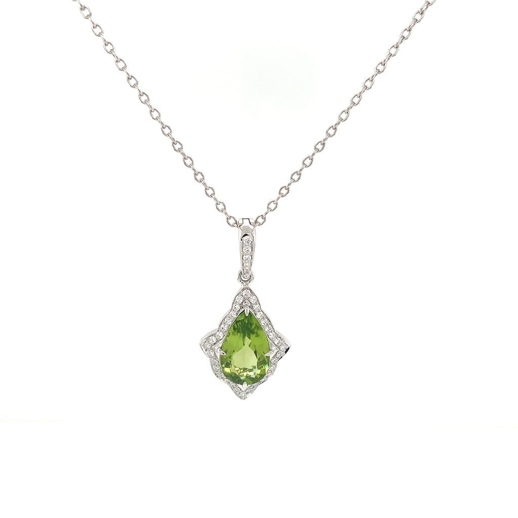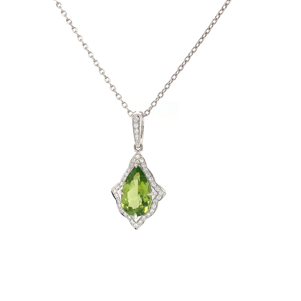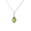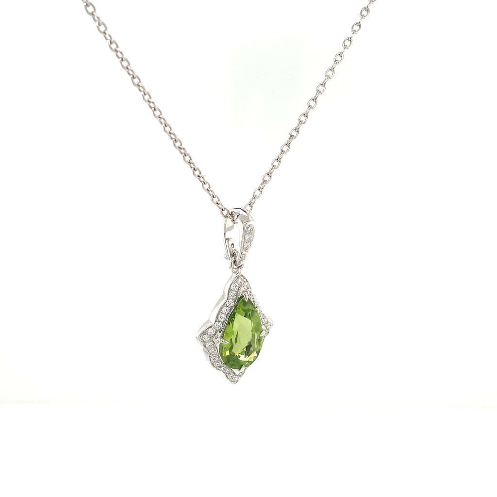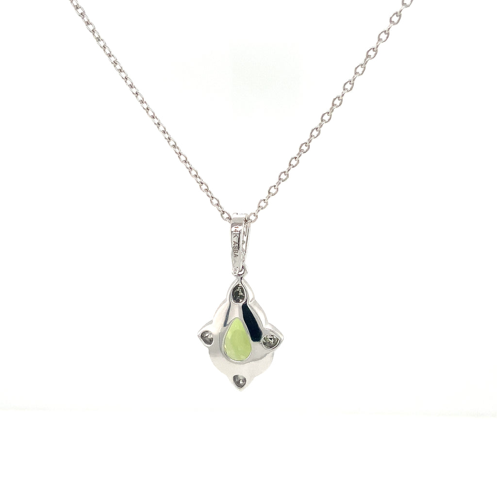 ASBA Collection Gem Quality Art Deco Inspired Pear Shape Peridot and Diamond Pendant Set in 14K White Gold. 1 Pear Shaped Peridot with a total weight of 8cts. t.w