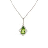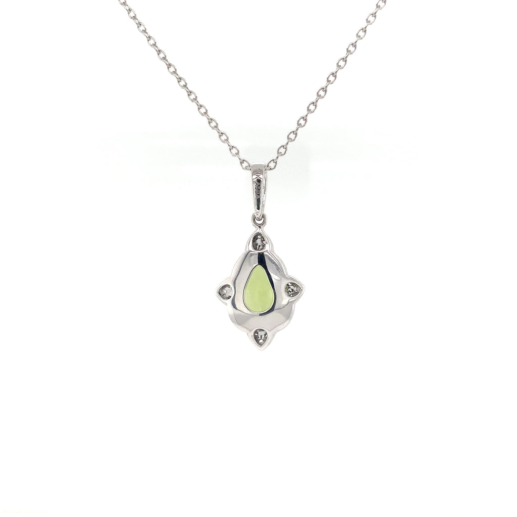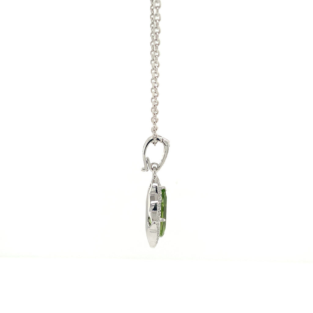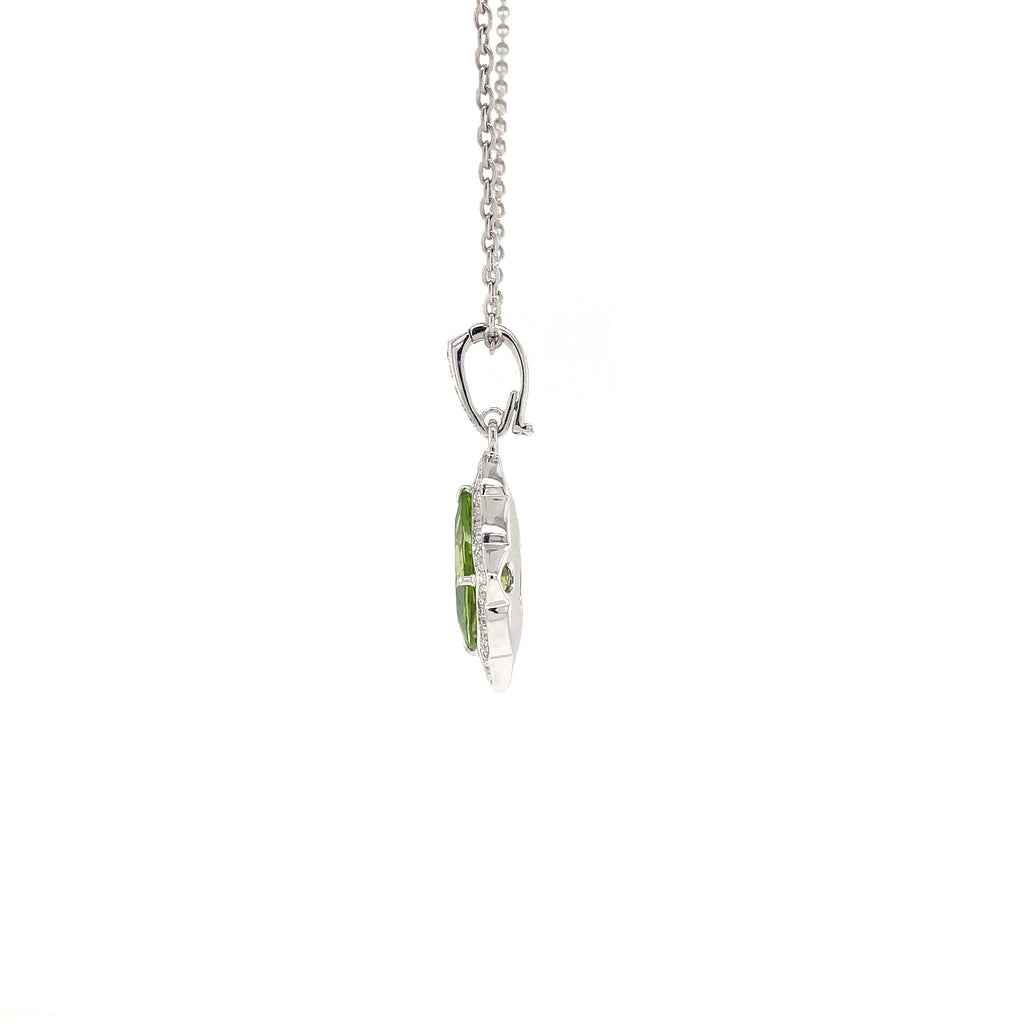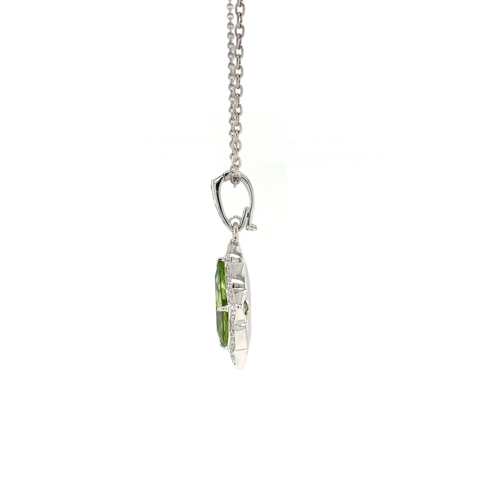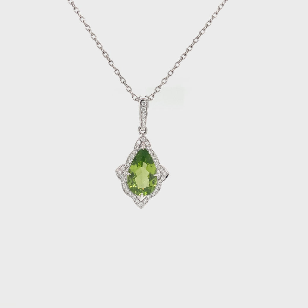 ASBA Collection Gem Quality Art Deco Inspired Pear Shape Peridot and Diamond Pendant Set in 14K White Gold. 1 Pear Shaped Peridot with a total weight of 8cts. t.w
