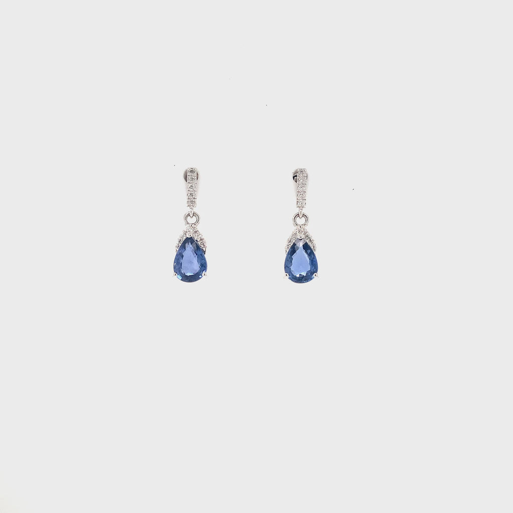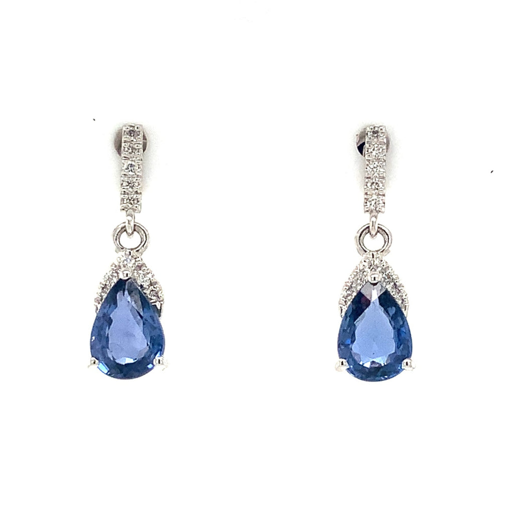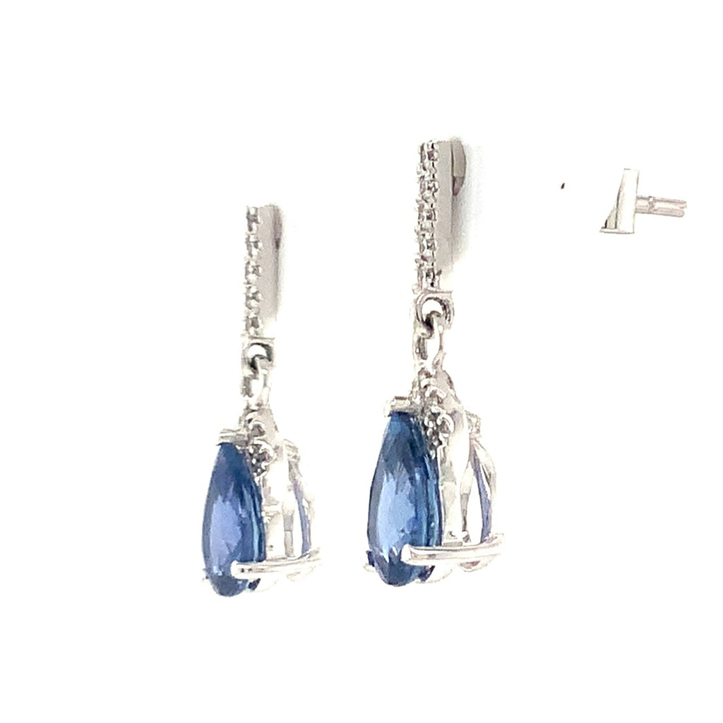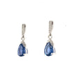 David Kord Pear Shap Sapphire and Diamond Earring set in 18K White Gold with post and clutch backing closure. This petite design contains the following: