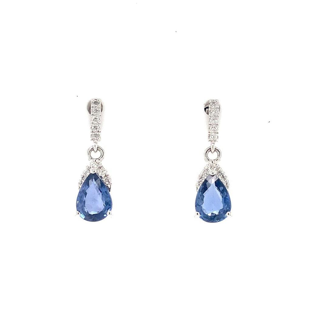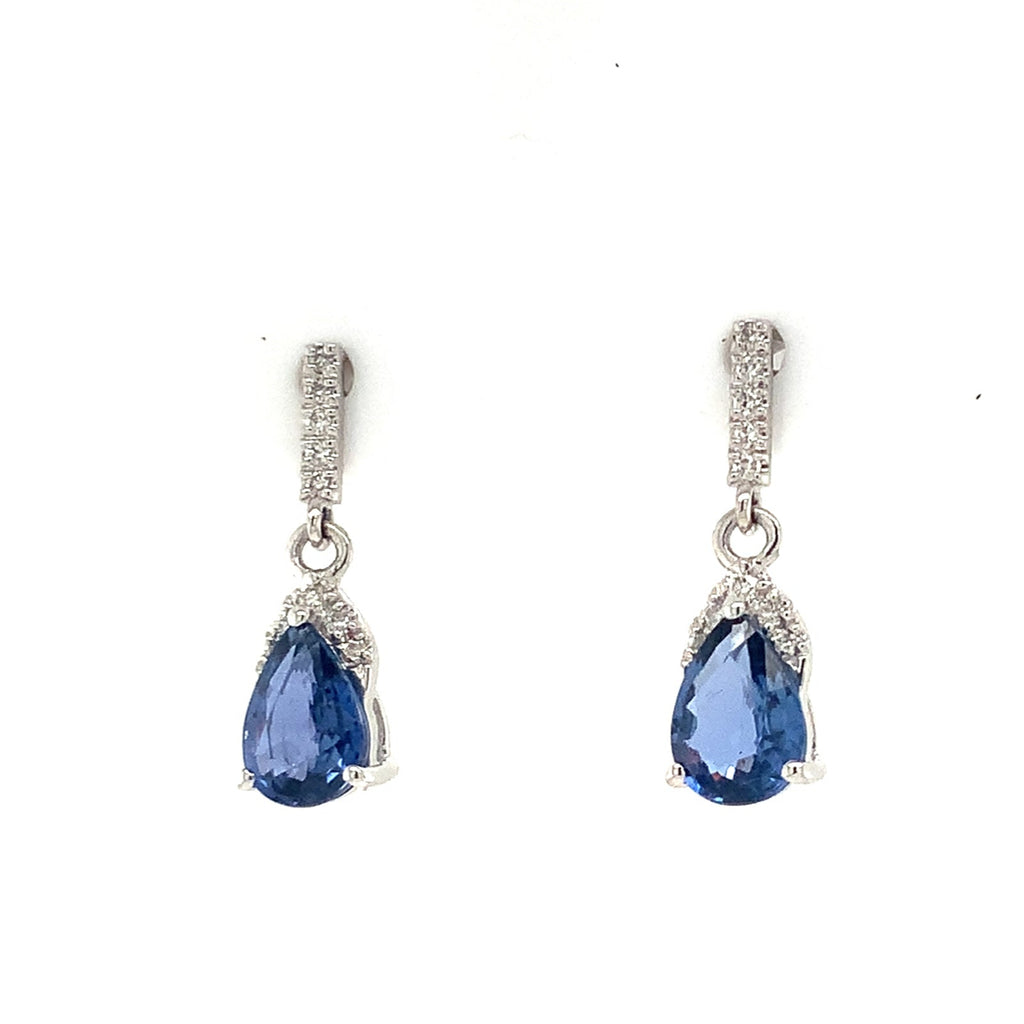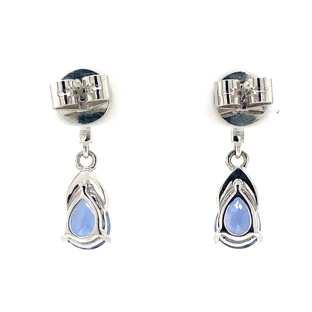 David Kord Pear Shap Sapphire and Diamond Earring set in 18K White Gold with post and clutch backing closure. This petite design contains the following: