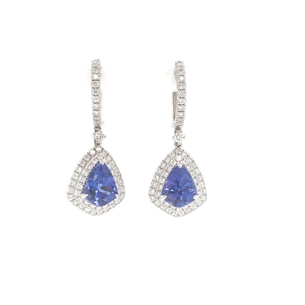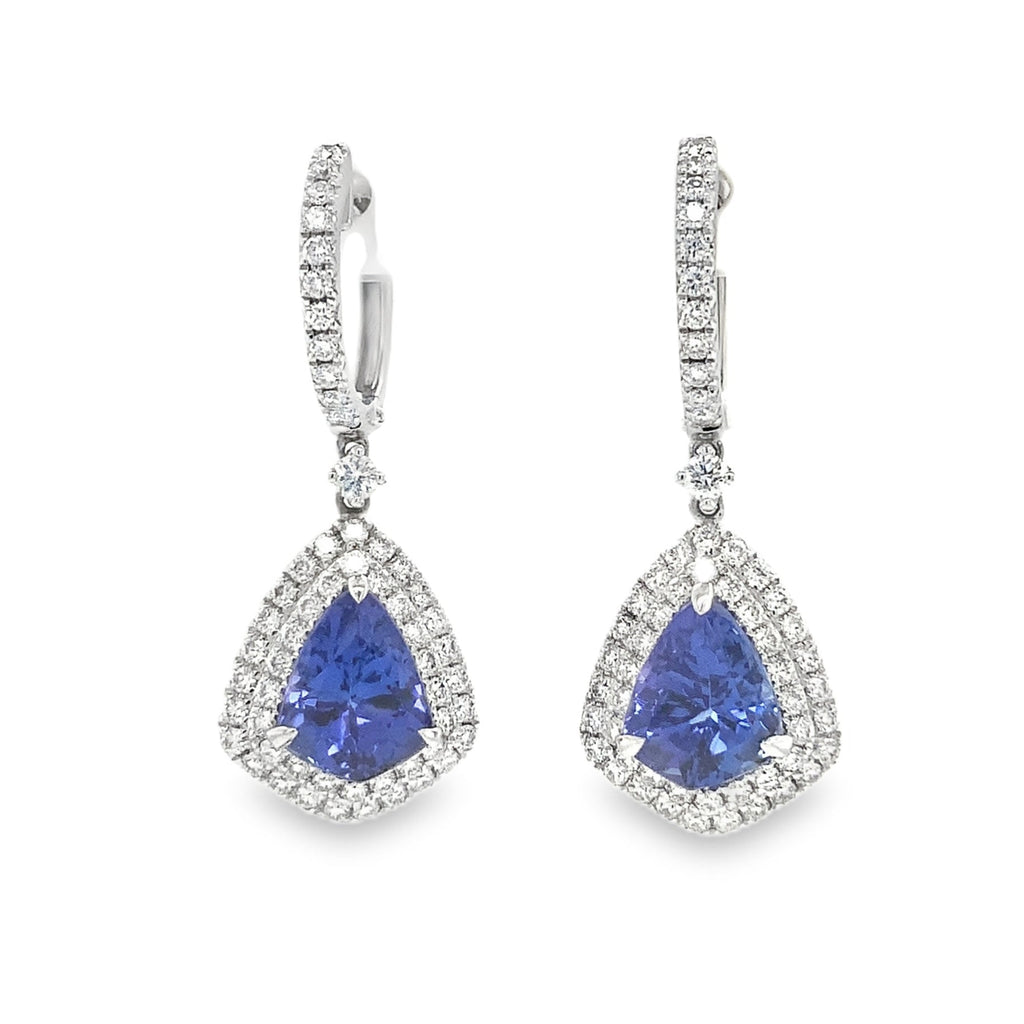 These double halo drop earrings showcase two mixed-cut trapezoid tanzanites totaling 4.02 carats, accented by 116 round brilliant diamonds weighing 2 carats t.w.