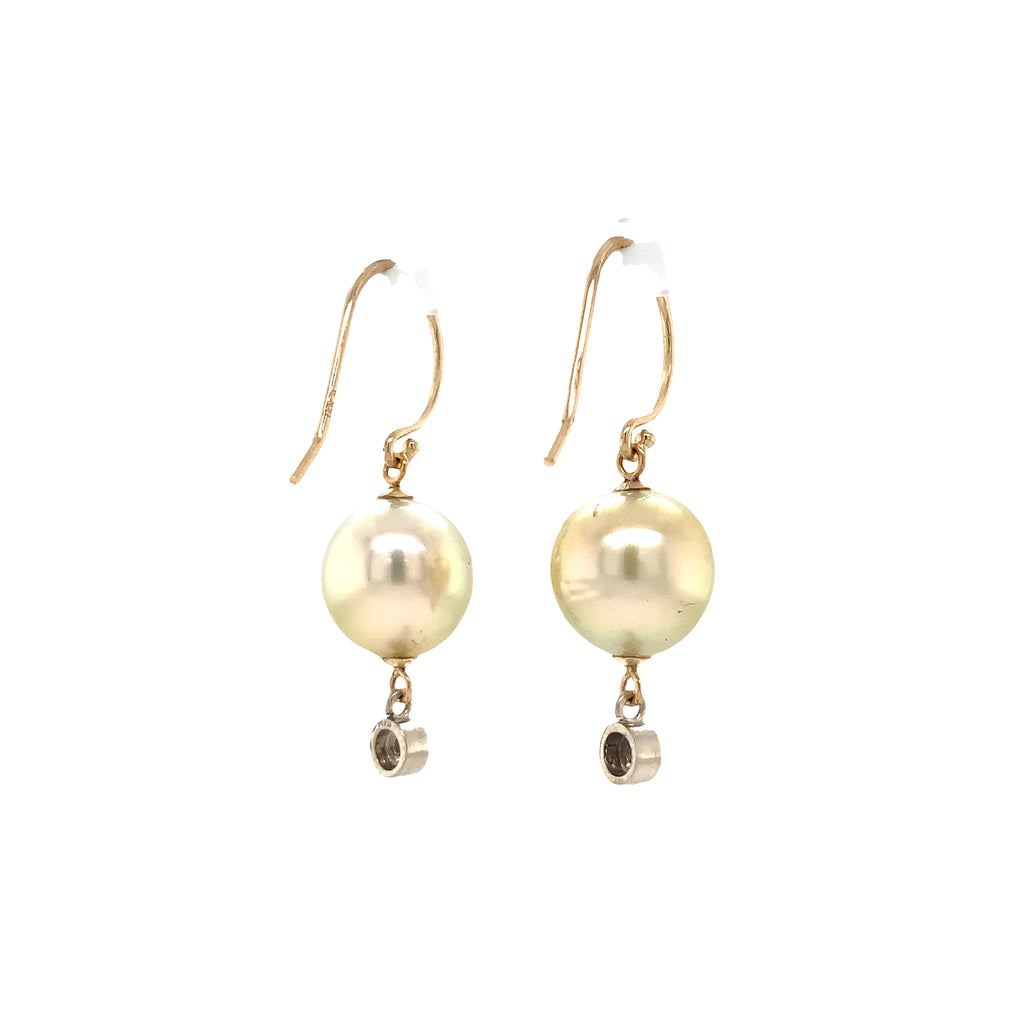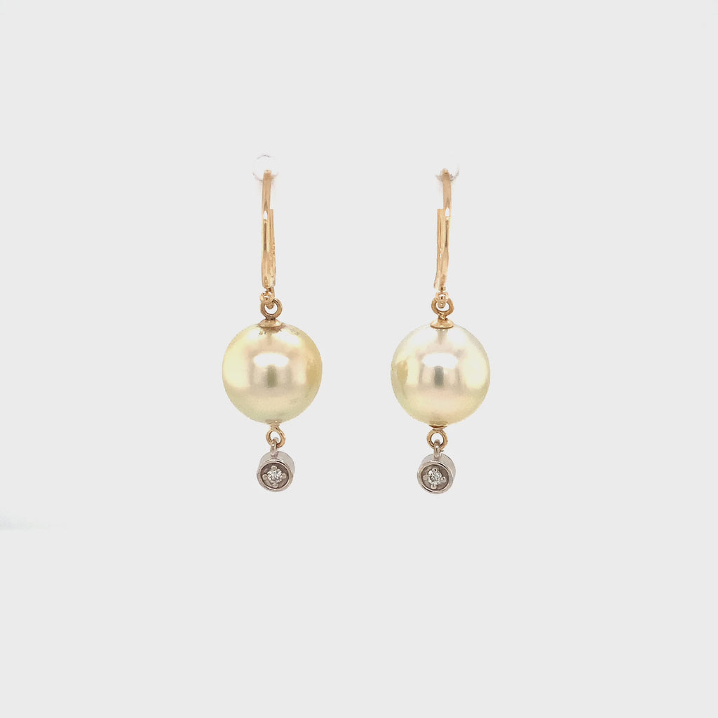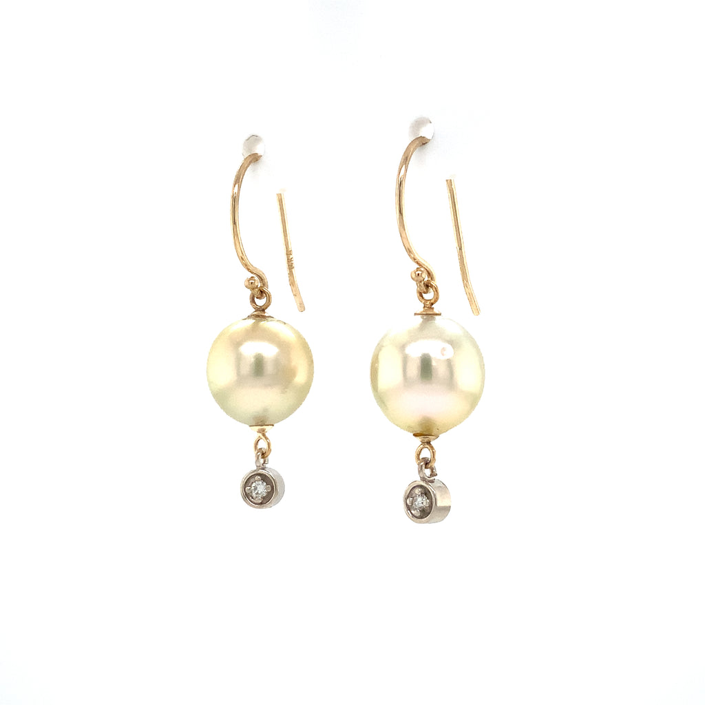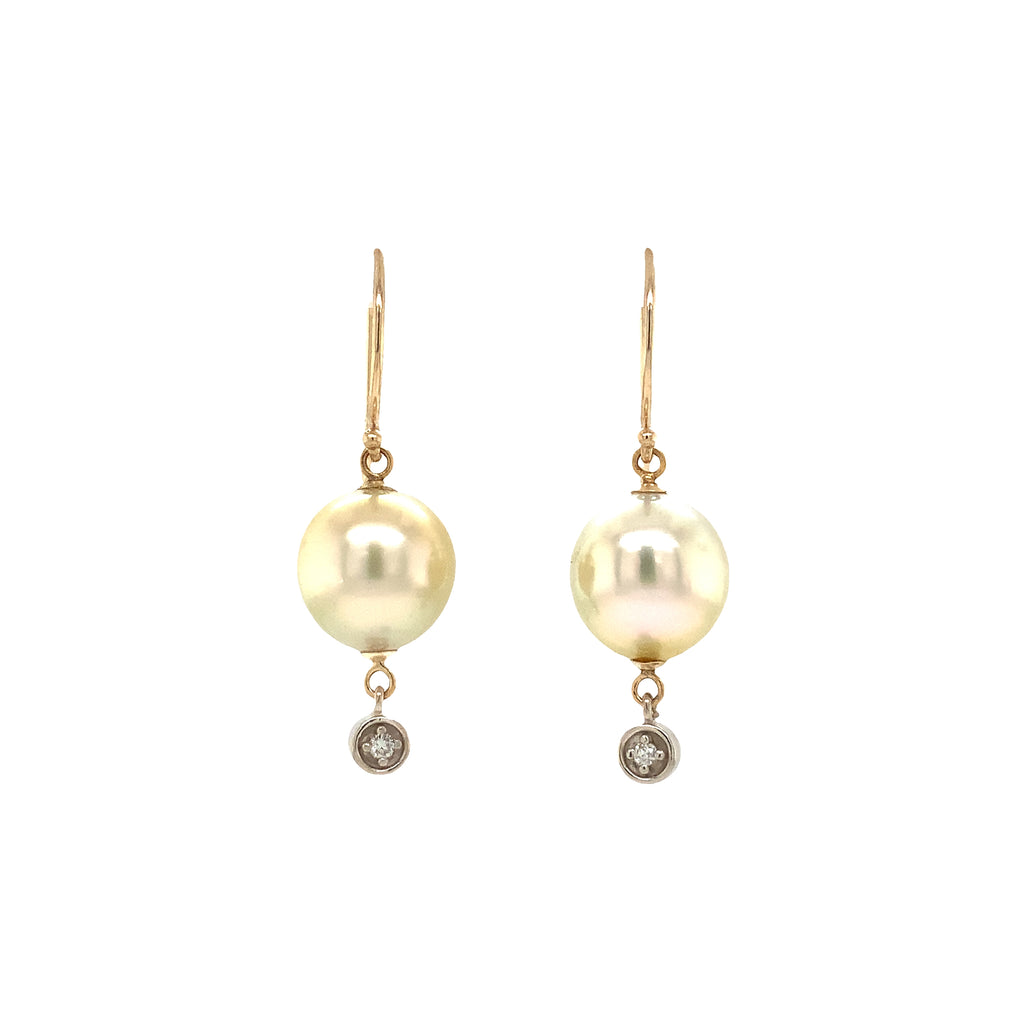 These South Sea pearl and Diamond 14K Yellow Gold French Wire Drop Earrings showcase a Light Golden South Sea pearl boasting excellent nacre and shine. The pearls are 10 mm in diameter, semi-round in shape, with two Round Brilliant Diamonds totaling 0.06 carats. The diamonds have a color grade of G and a clarity grade of SI, and are set in a 14K White Gold Bezel. These earrings are securely held in place by a French Earring Wire and weigh 4.0 grams.