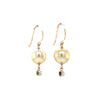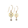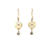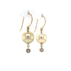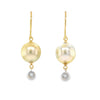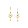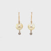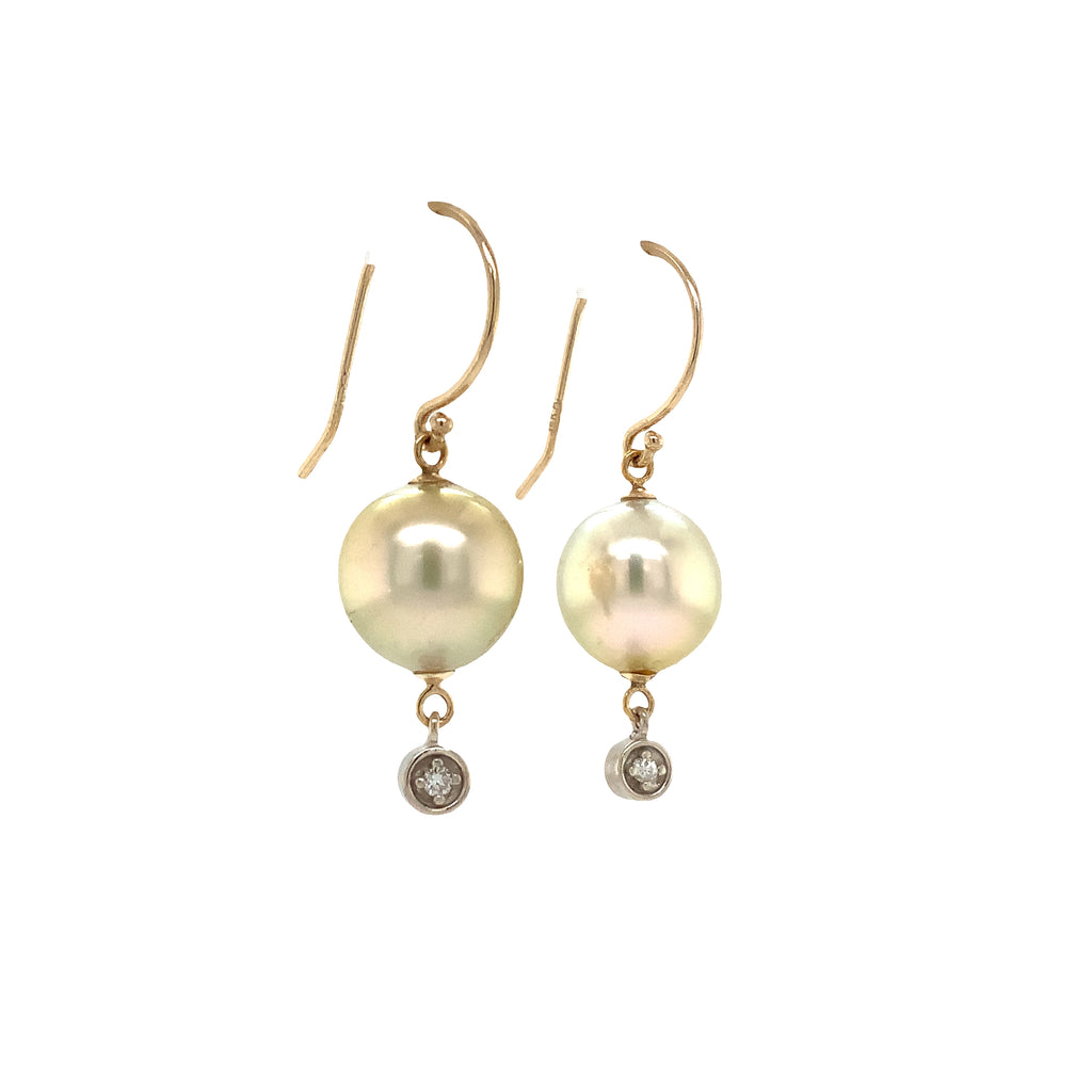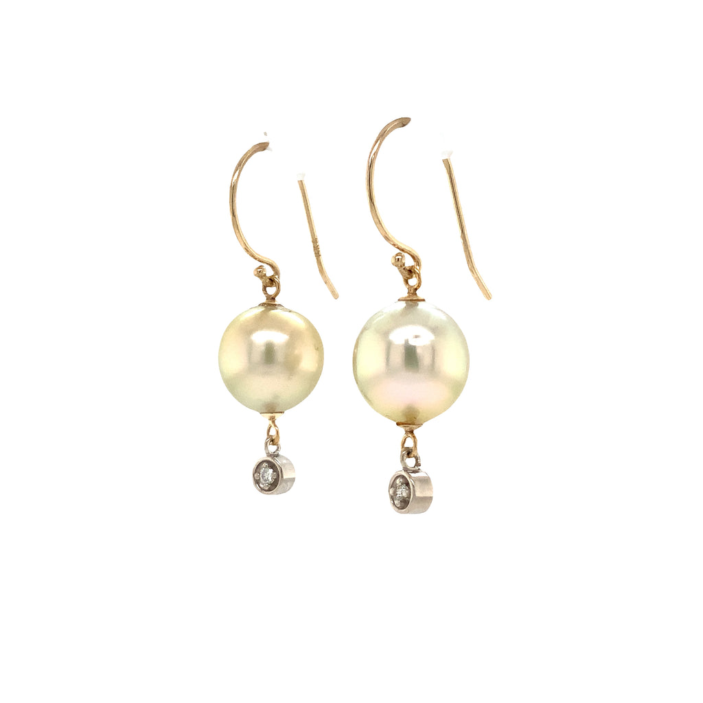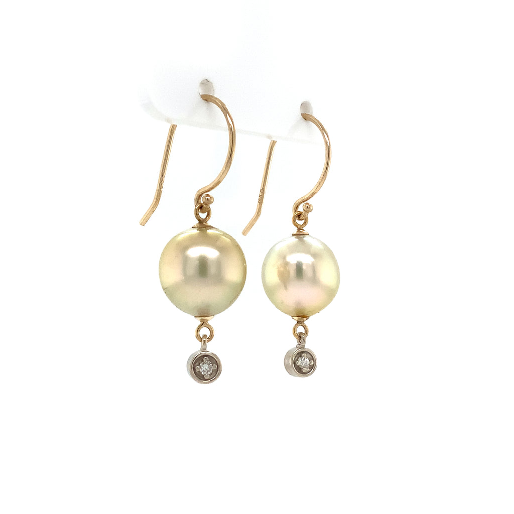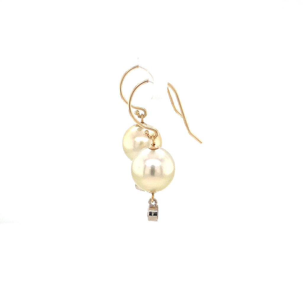 These South Sea pearl and Diamond 14K Yellow Gold French Wire Drop Earrings showcase a Light Golden South Sea pearl boasting excellent nacre and shine. The pearls are 10 mm in diameter, semi-round in shape, with two Round Brilliant Diamonds totaling 0.06 carats. The diamonds have a color grade of G and a clarity grade of SI, and are set in a 14K White Gold Bezel. These earrings are securely held in place by a French Earring Wire and weigh 4.0 grams.