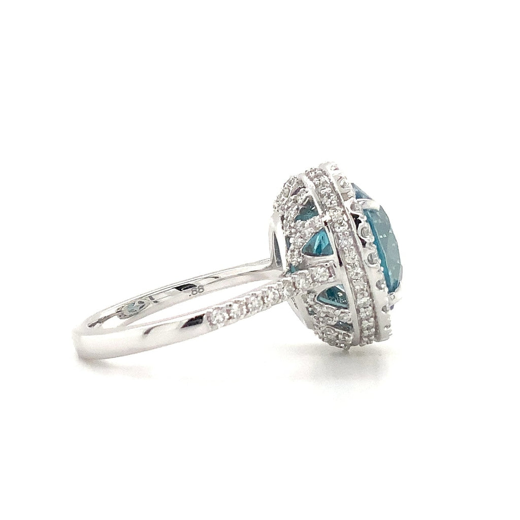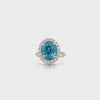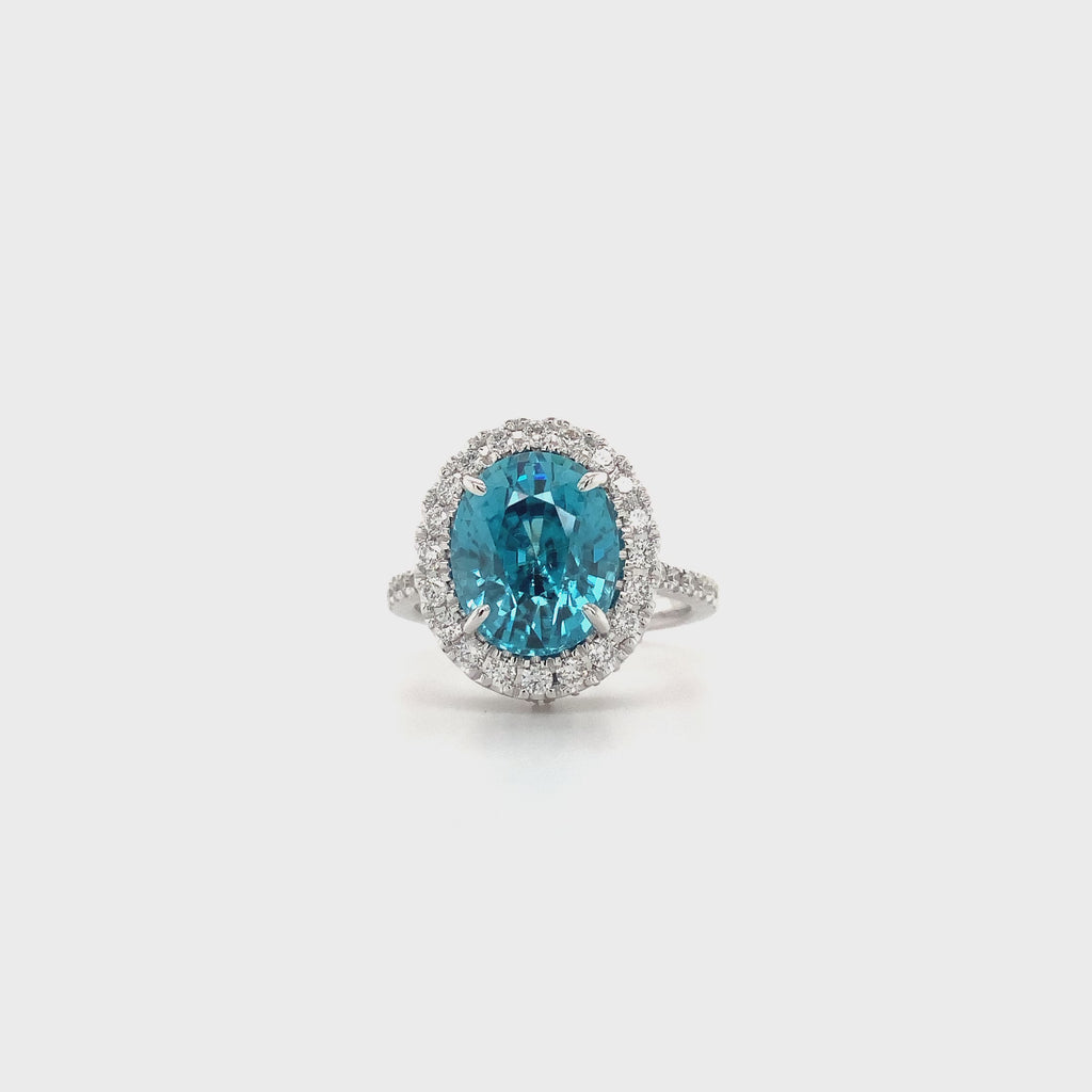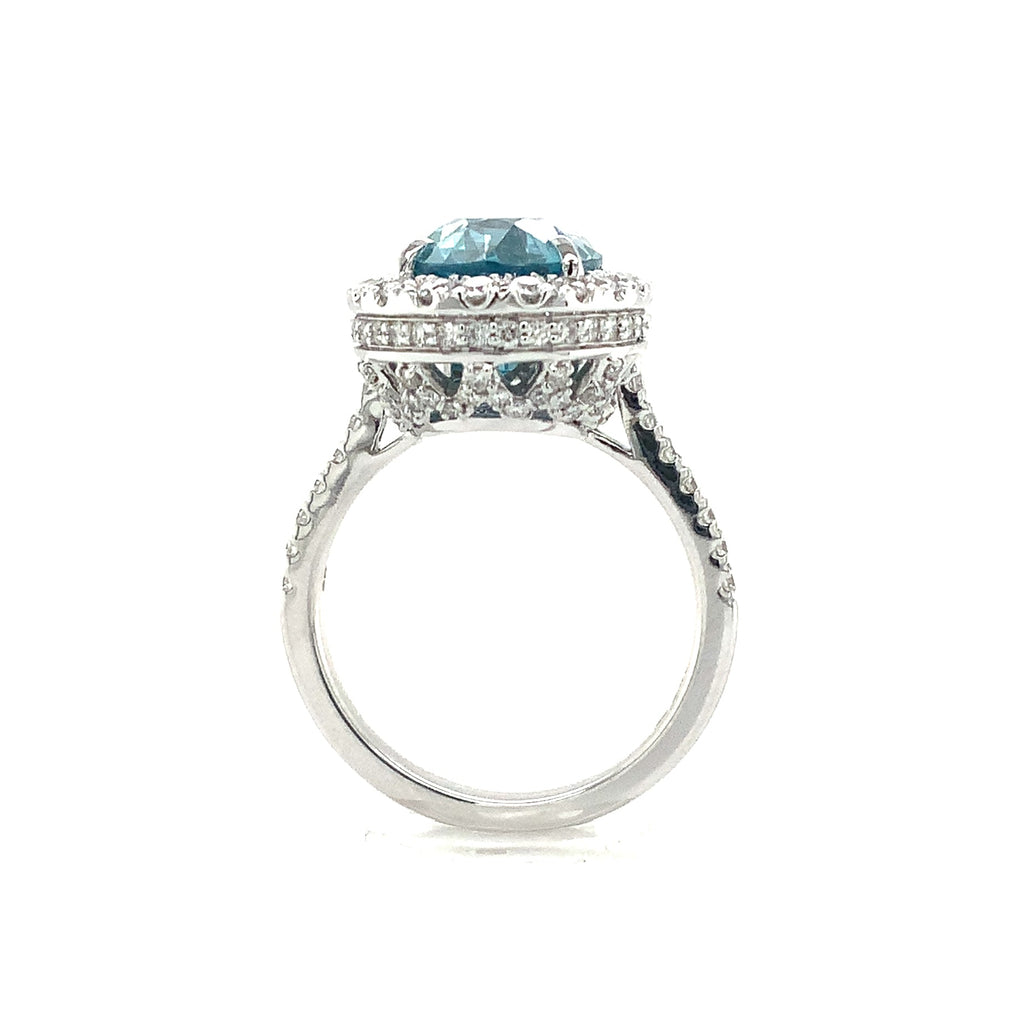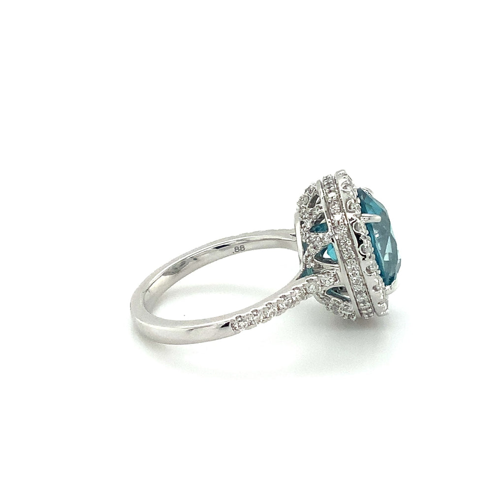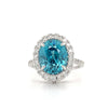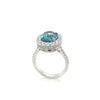 Gem Quality Halo Style Blue Zircon and Diamond Ring set in 14K White Gold.