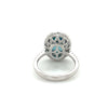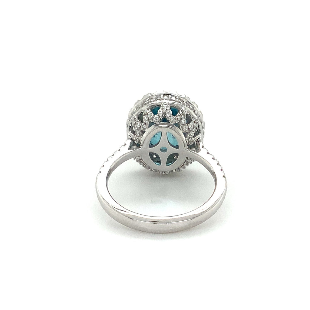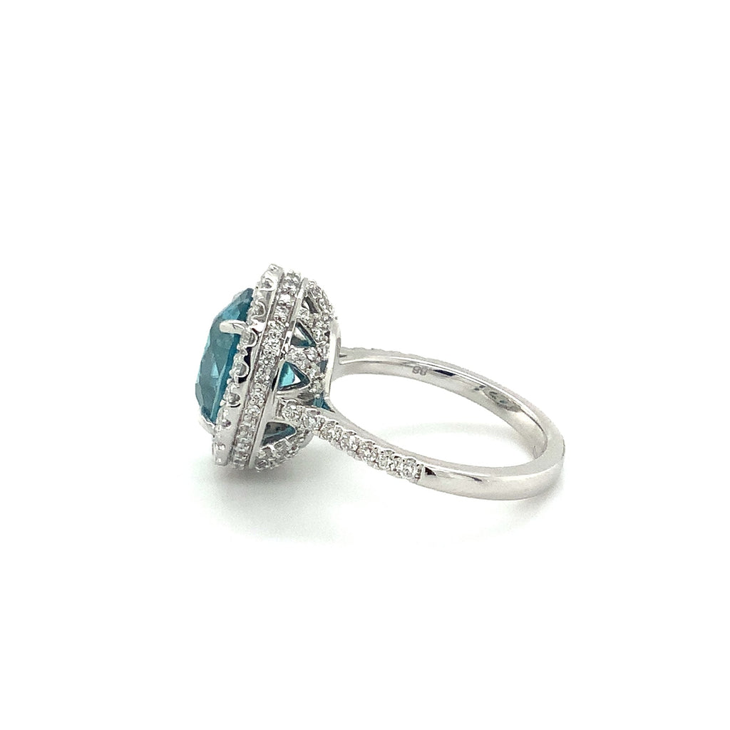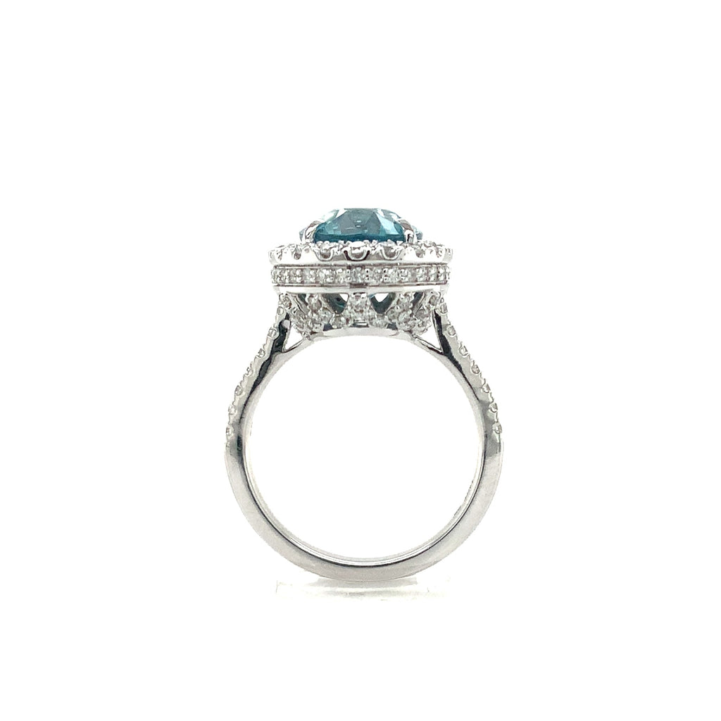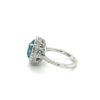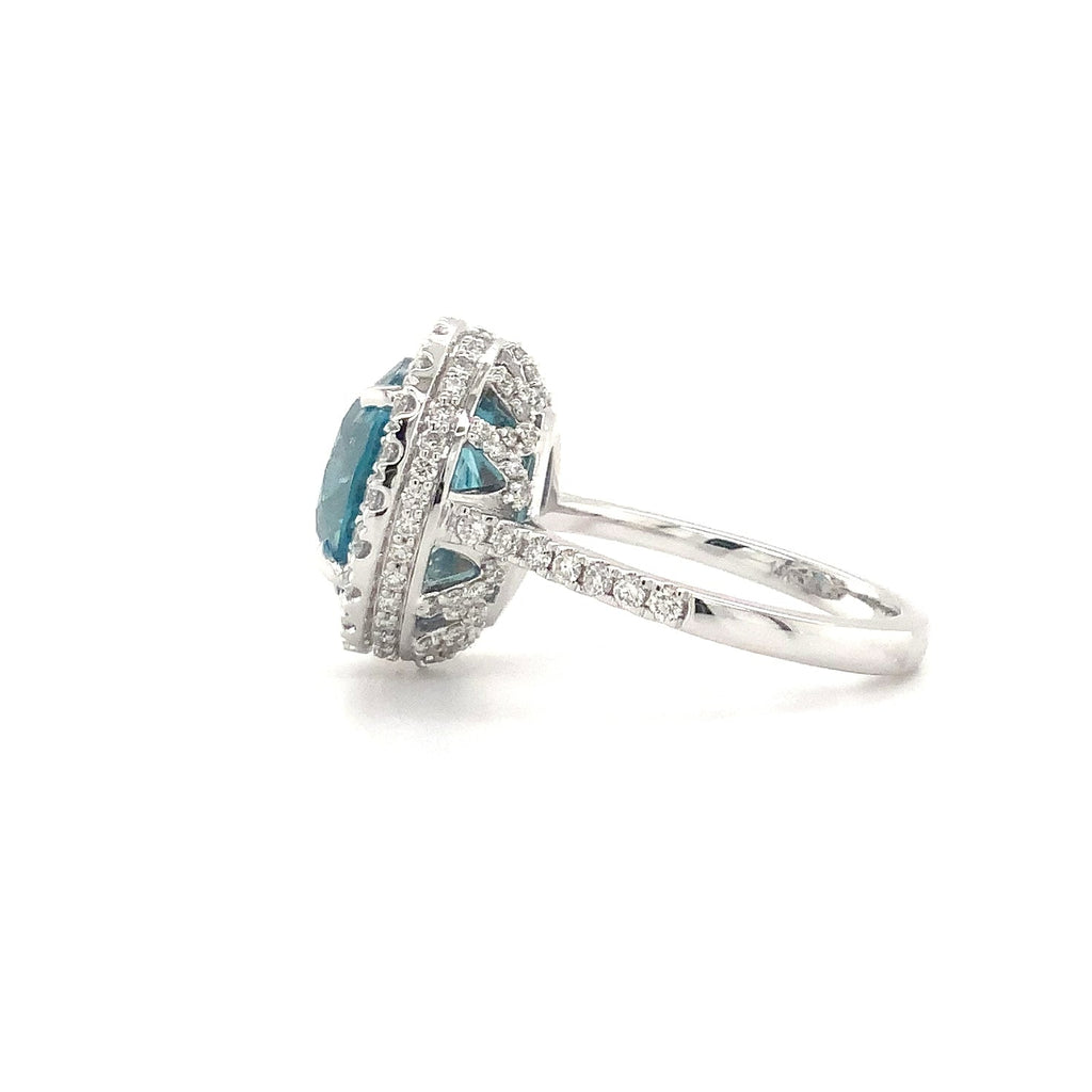 Gem Quality Halo Style Blue Zircon and Diamond Ring set in 14K White Gold.