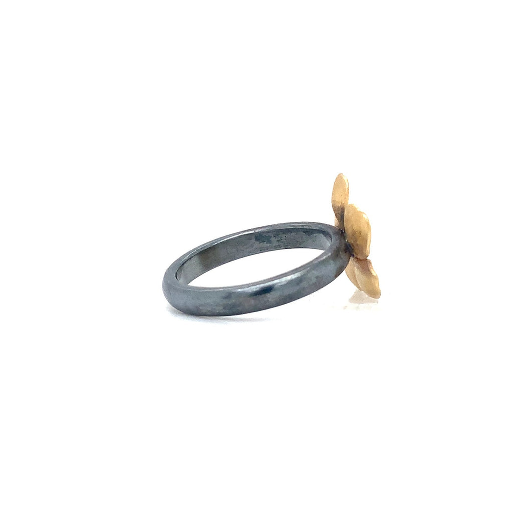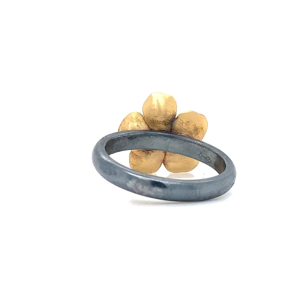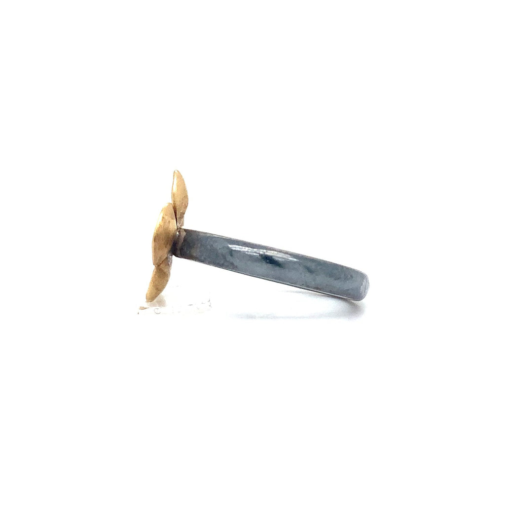 One 14mm Buttercup Flower in 22K Gold on an Oxidized Silver Ring. This ring can be stacked with some of Lika's other rings.