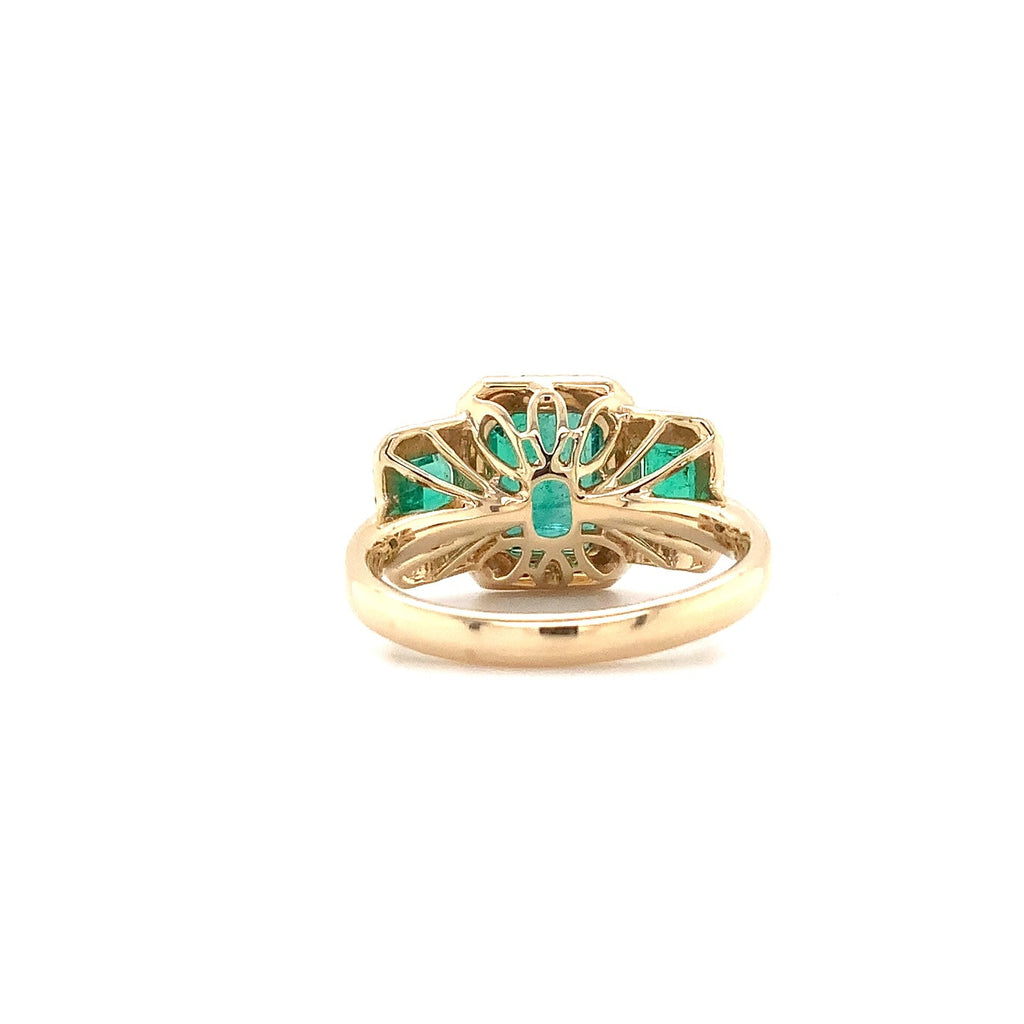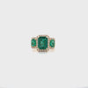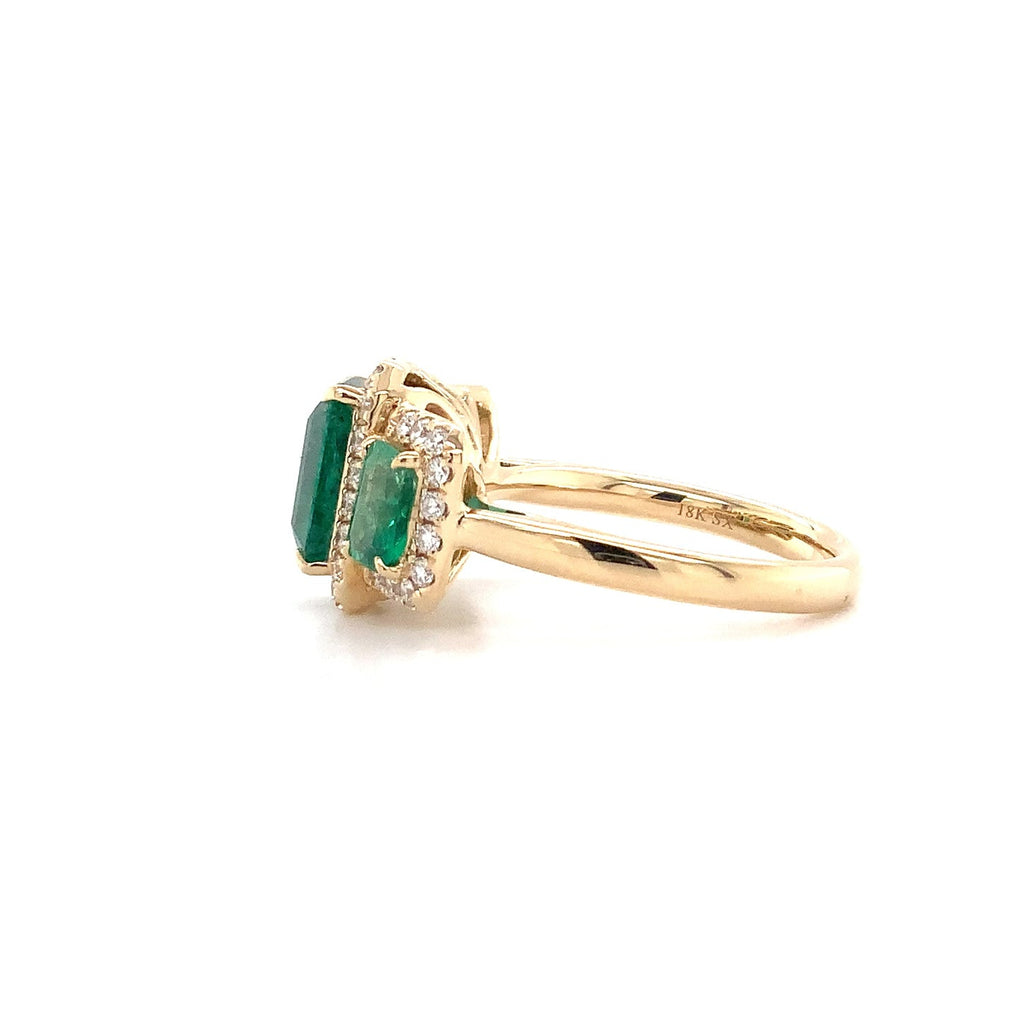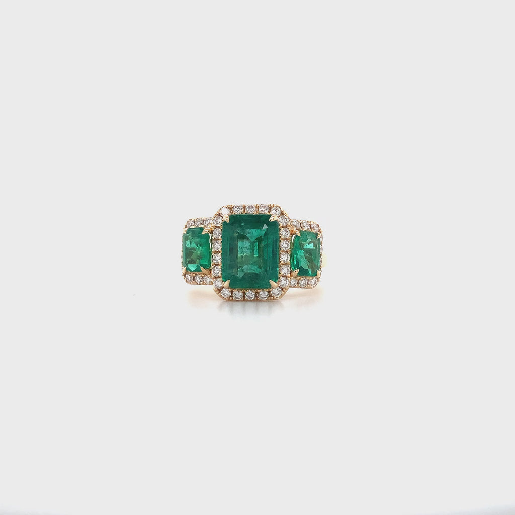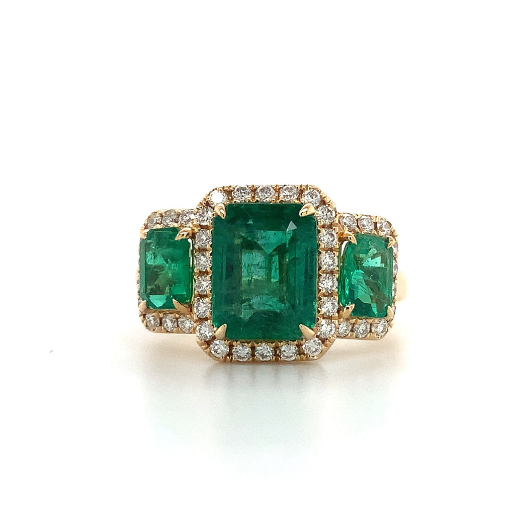 Three Stone Emerald and Diamond Halo Style Ring set in 18K Yellow Gold.