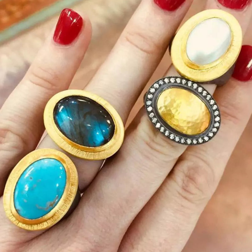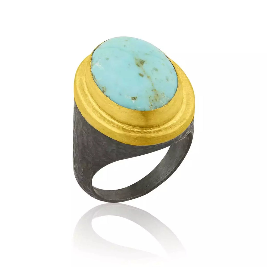 The Lika Behar Pompei Turquoise Therapy Ring features an oval turquoise stone weighing 7.29 carats, set in 24K gold and oxidized silver.