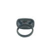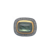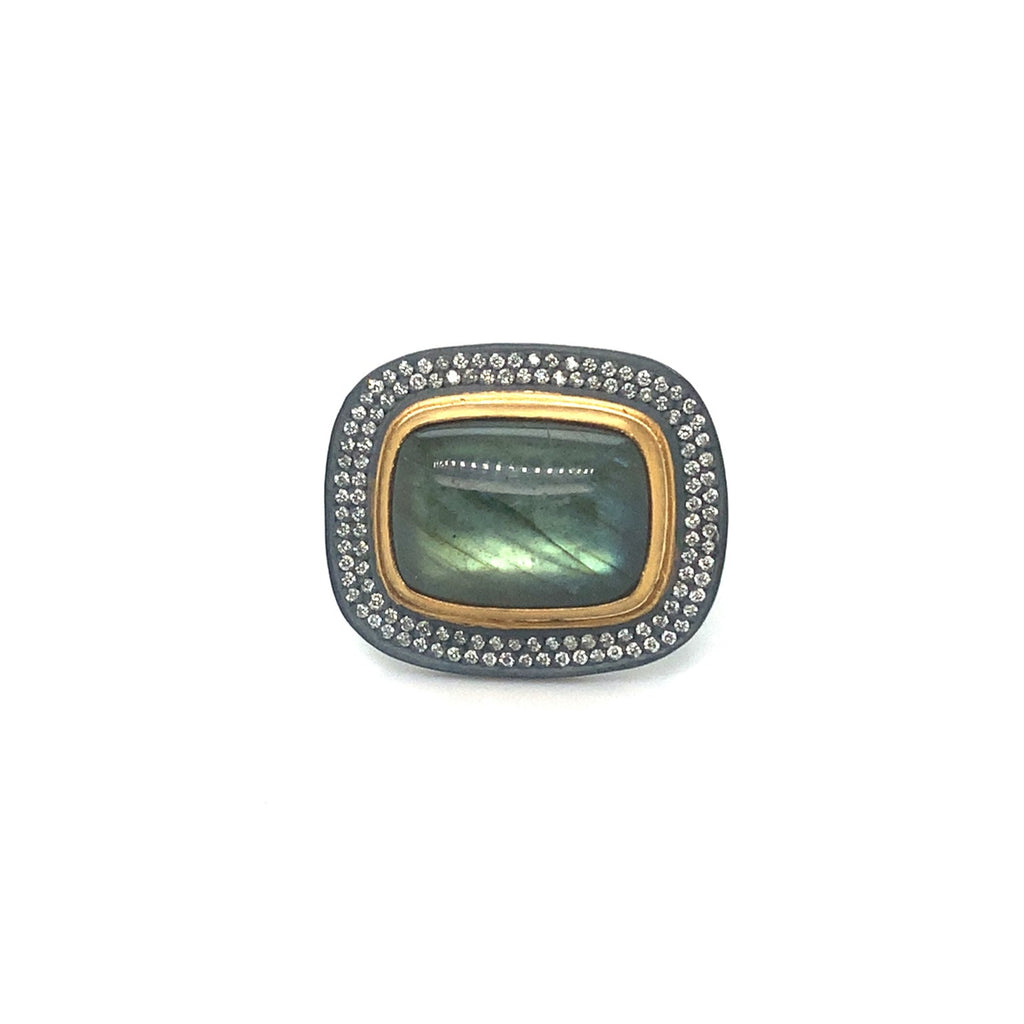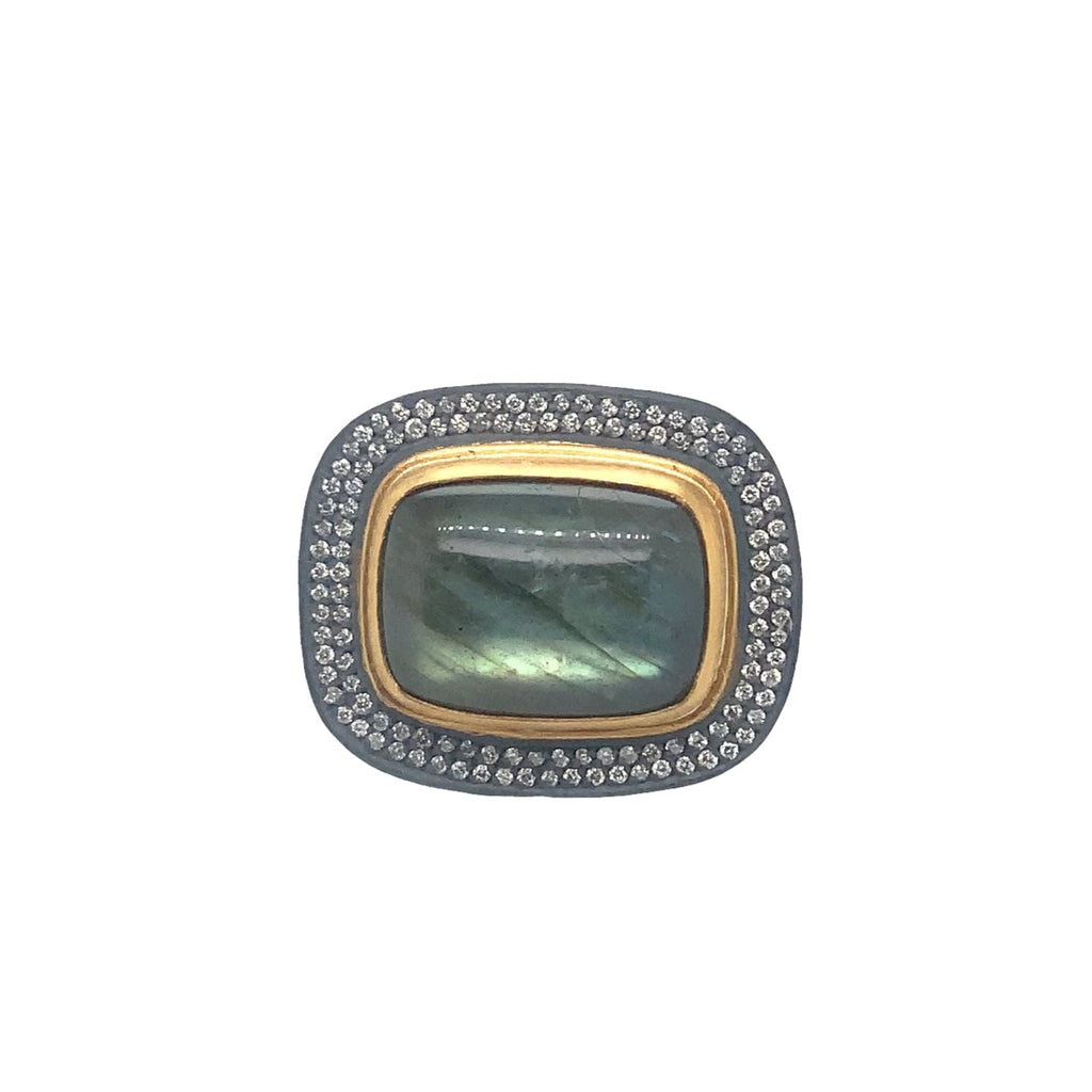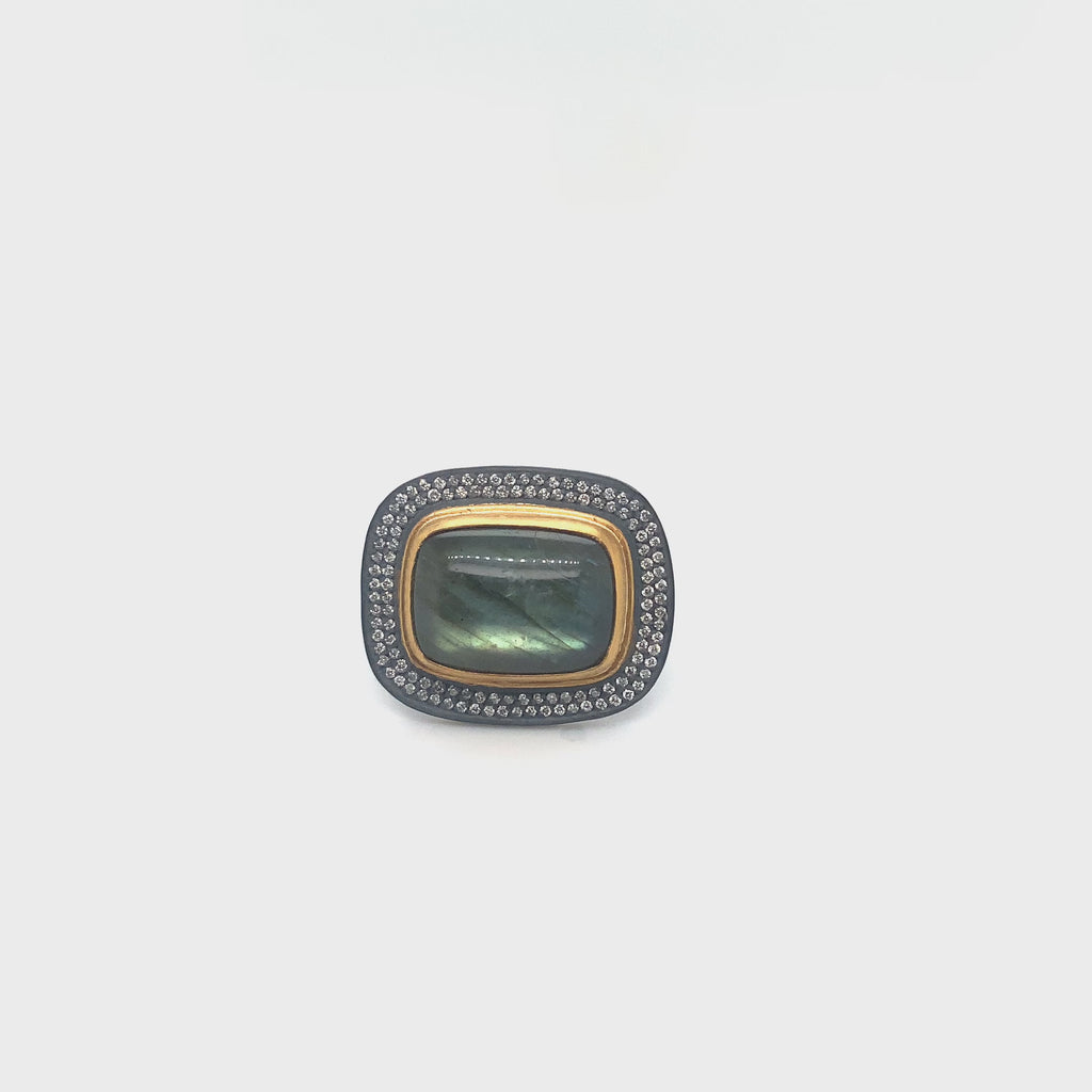 This Ring contains one cushion cabochon labradorite =10.23 cts with East-West double halo gray diamonds with a total weight of 0.50 ctw.