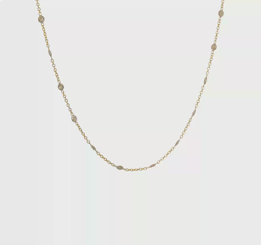 Diamond by the Yard 18K Two-Tone Bezel-Set Necklace.32 Round Brilliant Cut Diamonds = 0.32 ct.Each bezel measures 2.7 mm.18-inch long, 1.25 mm cable chain with lobster clasp.This necklace weighs 3.50 grams.