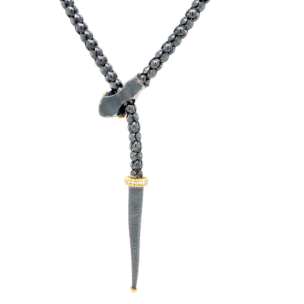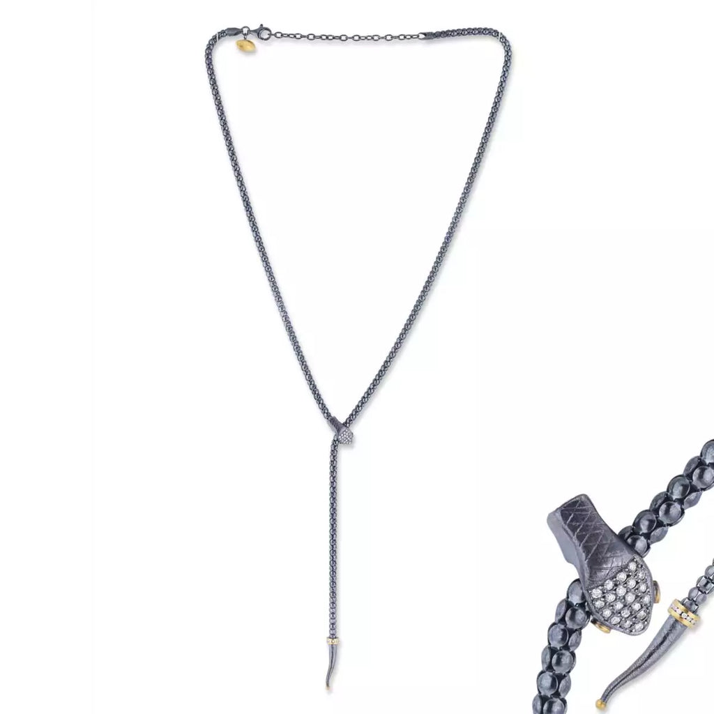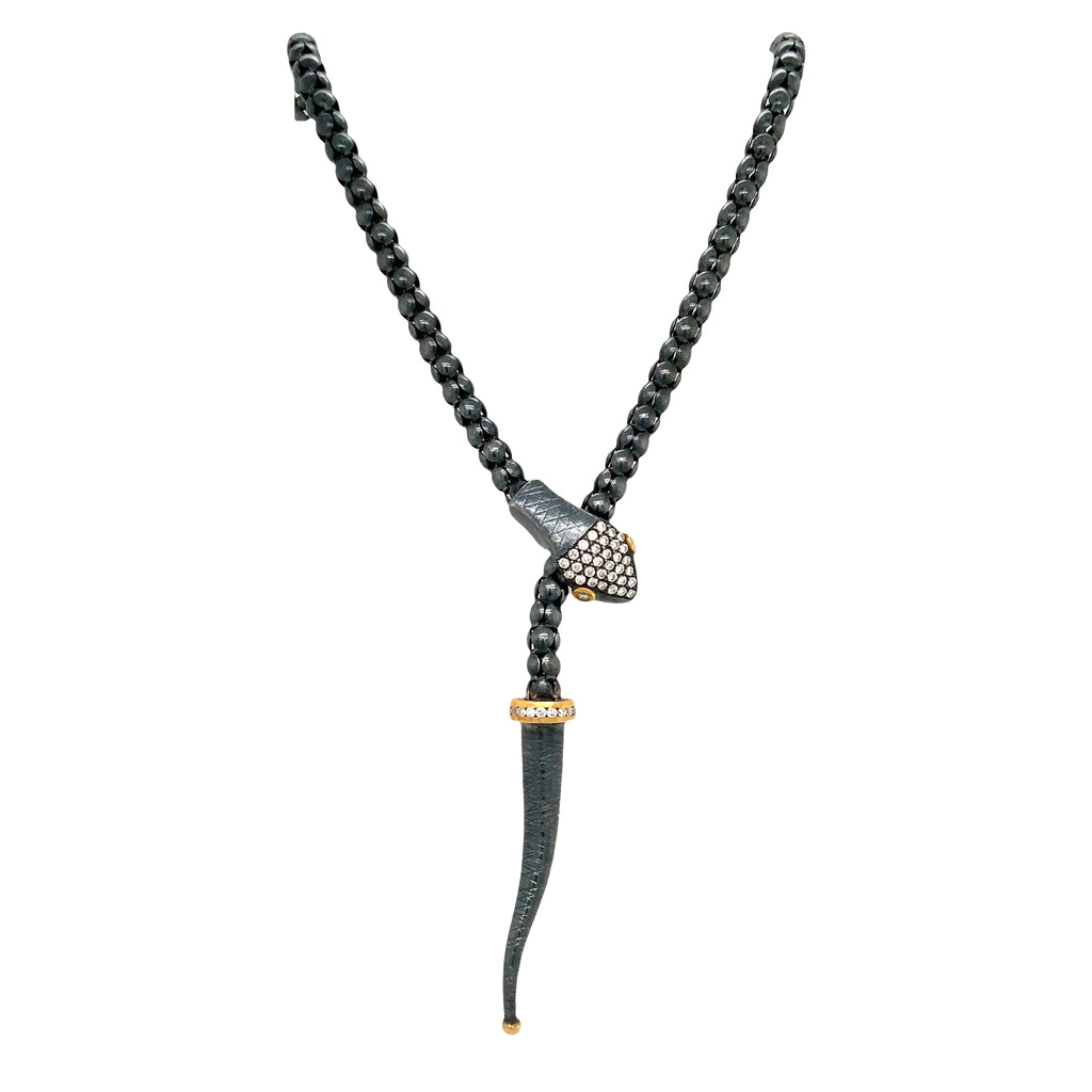 Lika Behar Yin and Yang Snake Collection 24K and Oxidized Silver Adjustable Lariat Necklace with Diamonds set on the Oxidized Silver Head, Gold Eyes & Around the Gold Rim in the tail.