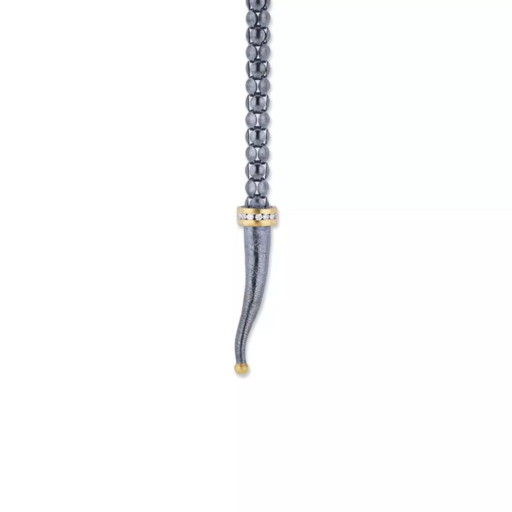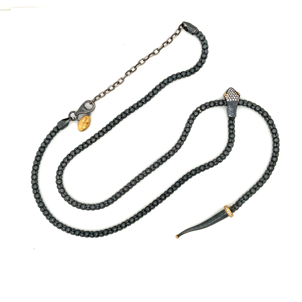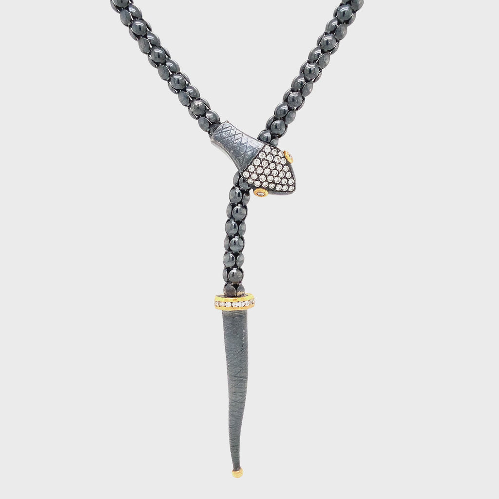 Lika Behar Yin and Yang Snake Collection 24K and Oxidized Silver Adjustable Lariat Necklace with Diamonds set on the Oxidized Silver Head, Gold Eyes & Around the Gold Rim in the tail.