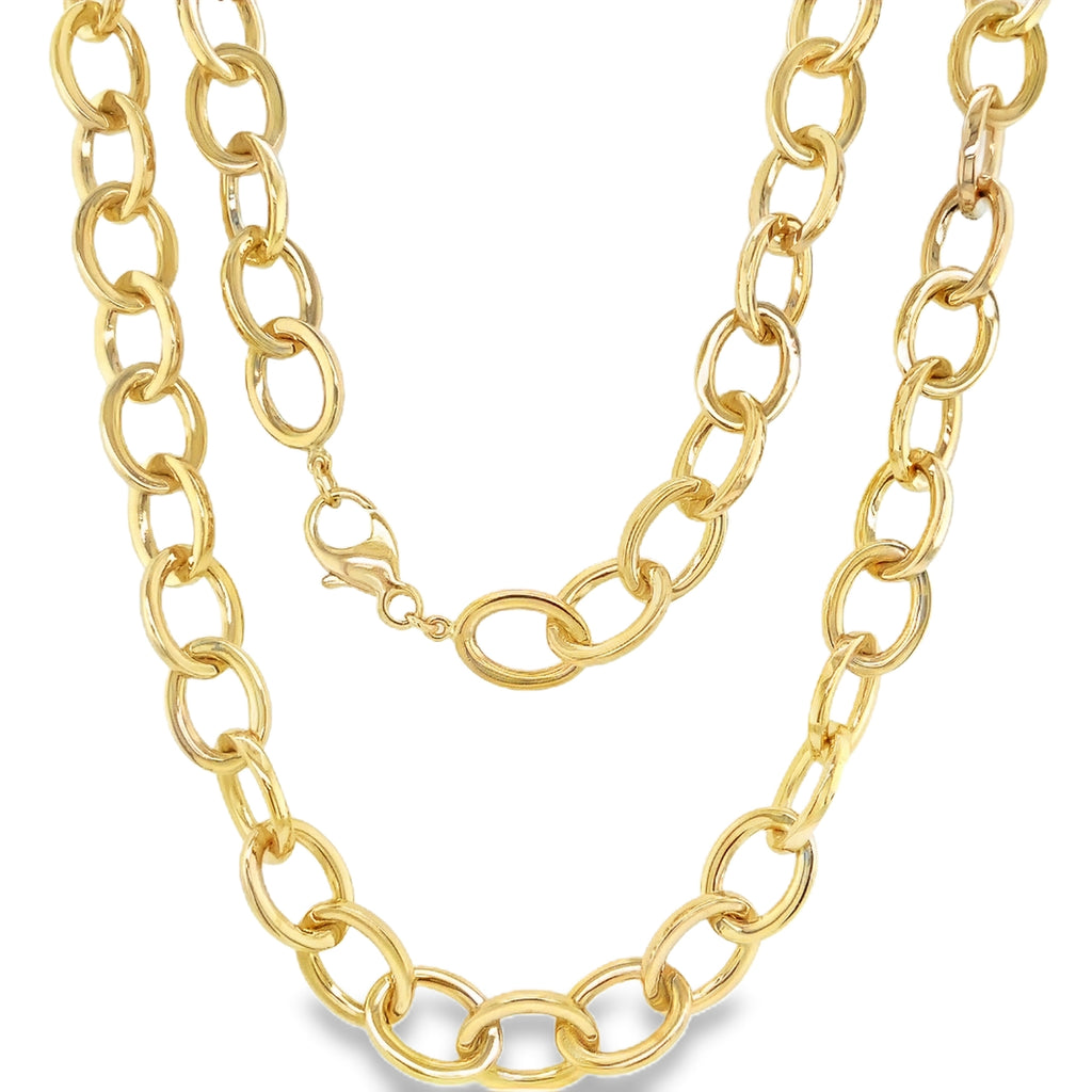 Crafted in 14K yellow gold, this sophisticated chain necklace features uniformly polished oval links, each measuring 9mm in diameter. The 18-inch length offers versatile styling options, while the refined fancy lobster clasp ensures secure closure. With a substantial 20.9-gram weight and bright finish, this piece delivers the refined elegance expected of fine jewelry.