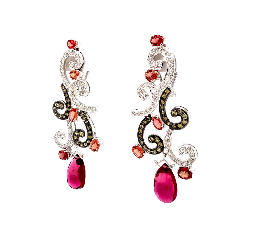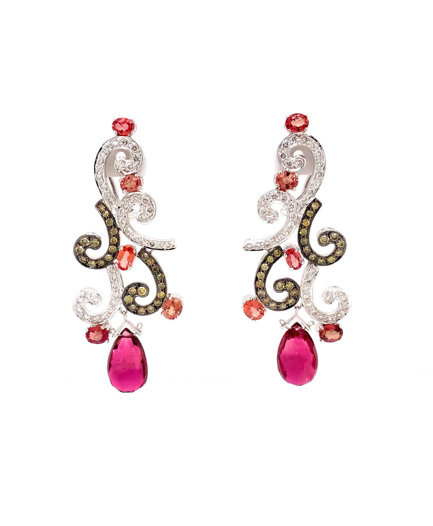 Pink Tourmaline, Padparasha, Fancy Yellow and White Diamond Lavalier Drop Earrings. 2.60 cts t.w. Diamond