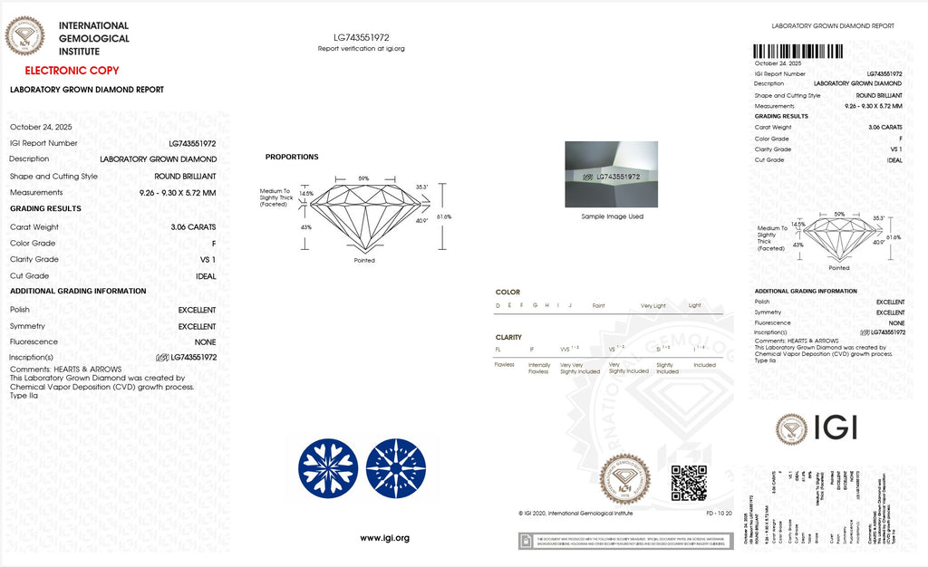 IGI Cert # LG743551972 F in color and VS1 in clarity