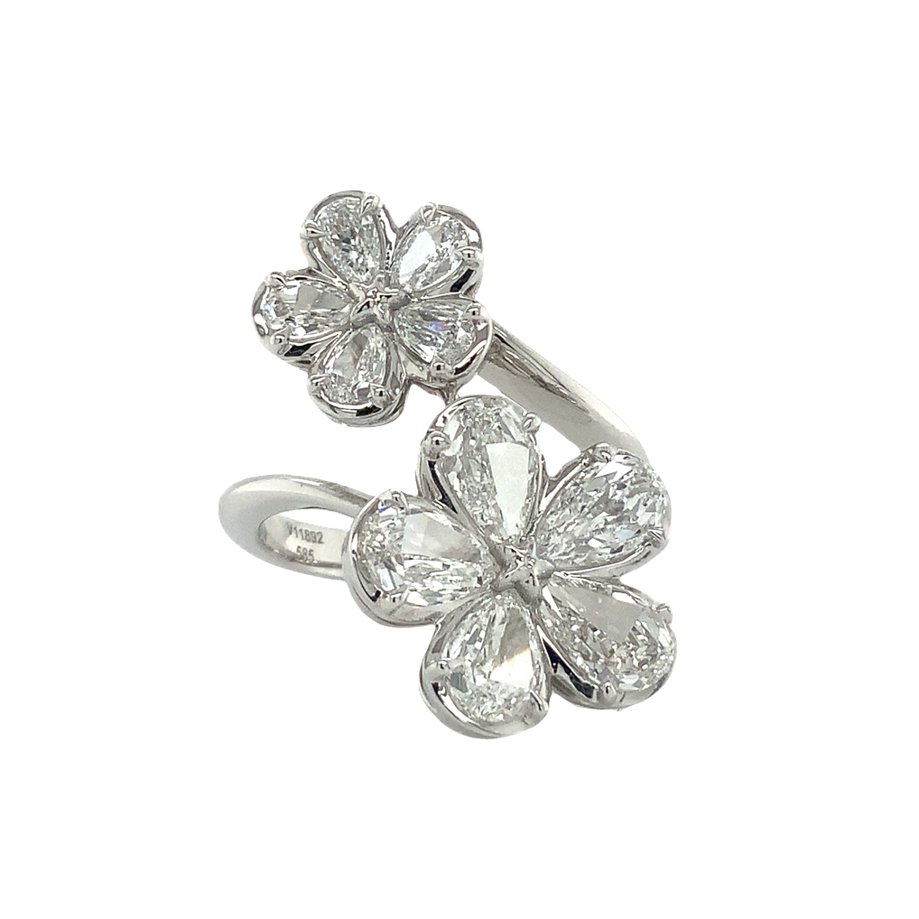Experience the exquisite beauty and expert craftsmanship of the Christopher Designs L'Amour Crisscut® Pear Shape Floral Cluster Bypass Right Hand Ring. Made with 14 kt white gold and featuring 10 lab grown pear shape diamonds totaling 2.37 carats (5 LLPE = 1.88 carats & 5 LLPE = 0.49 carats). Each diamond is a dazzling G color and boasts a VS clarity. This stunning ring has a diameter of 15.32 x 11.18 mm and a weight of 7.1 grams, with a finger size of 6.75. Made in the USA, this ring has a unique serial number of V11892.